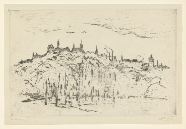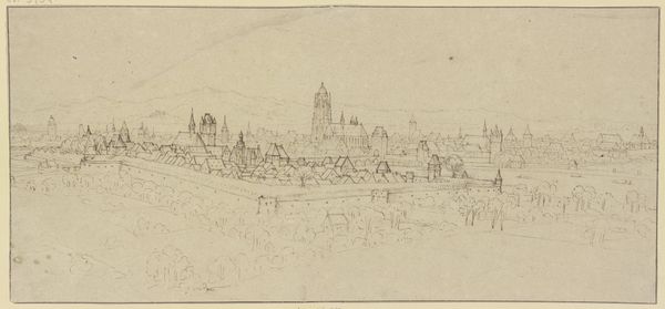Curator: At first glance, it seems almost spectral, doesn't it? Delicate pencil strokes barely there on toned paper, like a memory trying to solidify. Editor: Indeed. We're looking at "Studie til Glyptotekets 'Efteraarslandskab. Frederiksborg Slot i mellemgrunden,'" a preparatory drawing by Christen Købke from 1837-1838. You can find it here at the SMK. Curator: Købke catches something wistful here. The castle hovers, as if sketched from a half-remembered dream, all ethereal spires and crenellations. What paper and light pencil work achieves is a personal sketchbook feeling, intimate in a way, right? Editor: Precisely. This isn't just a landscape; it’s an exploration of form. Note the delicate hatching that suggests depth, the subtle tonal shifts on the toned paper. It exemplifies his understanding of perspective, guiding the eye from the foreground trees back to that imposing architectural form. Look at how light captures the towers; and consider their arrangement as simple, visual devices that carry across this sketchbook style into the finished canvas artwork. Curator: Makes you think about what captivated him most. Not the sheer grandiosity of the castle—anyone can do pomp and circumstance—but its presence, a looming fixture in his own world. You get this palpable sense of Copenhagen from all of his artwork! Editor: Yes, in examining it closely, consider how Købke prefigures modern art’s exploration of liminal spaces – those in-between zones. The drawing style sits somewhere between concrete representation and the realm of the imagined. A real place is filtered through the artist’s sensibilities and brought forth using light pencil work. We should consider that Köbke has produced an intimate vision from ink experimentation and playful composition. Curator: I walk away contemplating, the everyday poetry Købke discovered; it's the art of truly *seeing* the familiar, and finding magic there. Editor: An appropriate insight, since his personal method allowed form to transform from observational to emotionally significant!