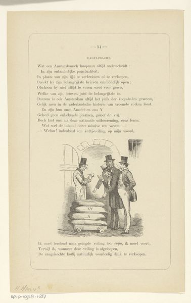 Curator: Alright, let's talk about "Father with Two Children Pointing to a Beggar in the Street," likely created between 1838 and 1912 by Isaac Weissenbruch. It's an etching, a monochromatic image showing exactly what the title says. It reminds me of something out of a cautionary tale – stark and moralizing. What's your first impression? Editor: It feels like a scene from a Victorian novel, very Dickensian. The stark contrast emphasizes the disparity between the well-to-do family and the beggar. What message do you think Weissenbruch was trying to convey? Curator: Good eye. To me, the power of this image rests in the way it presents this uncomfortable truth without flinching. Weissenbruch presents a clear, concise, visually engaging depiction, inviting us, then and now, to really consider that inequality staring us in the face. He’s making us watch the father’s lesson in real-time. And that directness is exactly how artists get the message across! What do you think that verse printed at the bottom contributes? Editor: Oh, right! It looks like old Dutch; "Learn what evil sin brings" is about all I can get from it. Curator: Precisely! A clear cut and slightly brutal message delivered with stark black lines etched into existence. Art serving as a bit of a mirror reflecting society's values… or lack thereof. What did you take away from this reflection, then? Editor: I hadn't considered how powerfully the text amplifies the picture's meaning, almost like a punchline. Curator: It is, isn't it? A memorable little tableau on human condition from Weissenbruch.
