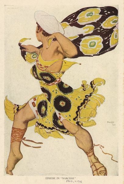Léon Bakst made this design for ‘Shepherd in Daphnis et Chloe’ and it's all about rhythm and movement. You can see how he's used colour to build the patterns of the costume. It’s this sense of layering and combining that gives the whole design a feeling of energy and life. Look at the way the dark brown of the figure is set against the bright, almost vibrating blues, reds, and greens of the costume. The paint looks thin, kind of translucent, like it’s been washed on, but then there’s this real detail, like the yellow bands around the figure's ankle, or the way the edges of the green fabric flare out. It feels like he's trying to catch the dynamism of the dance. Bakst reminds me a little of Sonia Delaunay, who also blurred the boundaries between costume and painting. This piece is just a reminder that art is always a conversation, a playful exchange across time and different mediums.