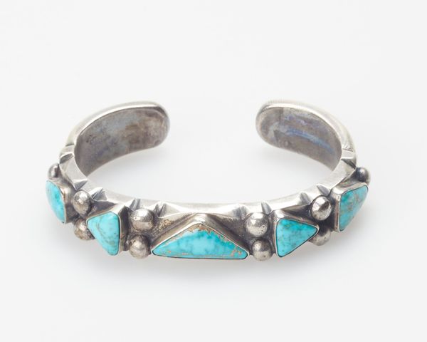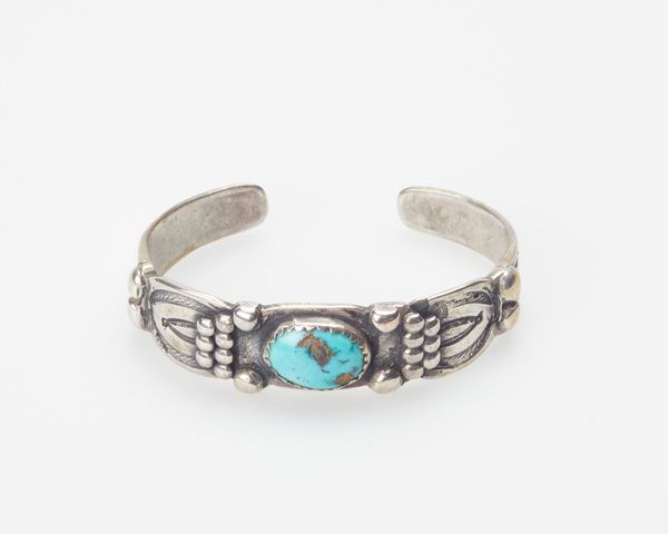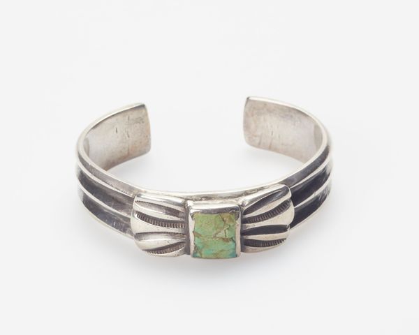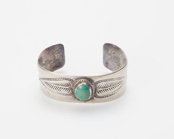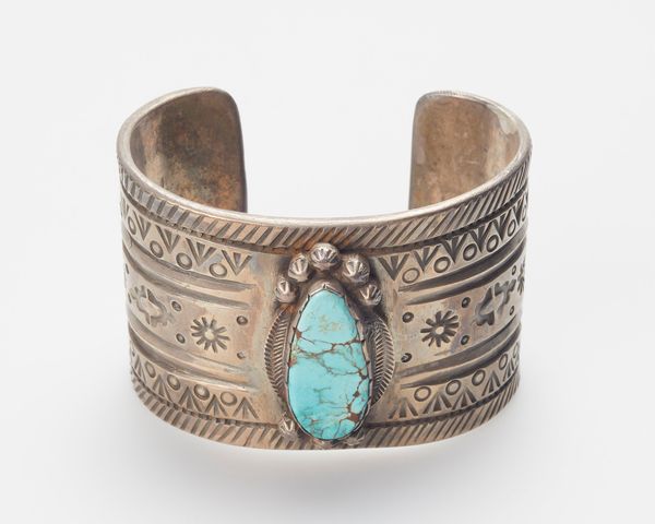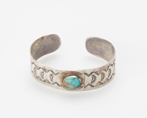 Curator: I'm struck by the immediate tranquility radiating from this piece, a bracelet crafted by a Navajo (Diné) artist around 1900. Its central turquoise stone is cradled in silver. I get a profound sense of enduring cultural expression. Editor: Yes, enduring! The Minneapolis Institute of Art holds this piece. You immediately notice the striking contrast, that vibrant, almost pulsating turquoise against the muted silver of the cuff. It's earthy and ethereal simultaneously. Curator: It's funny, isn’t it? That combination of metal and stone, suggesting something so strong, a bond with the Earth, a flow to the heavens... These Indigenous silverworks have always fascinated me because of their relationship to colonial trade routes. We often see smithing integrated into cultural exchange. The piece itself, though seemingly simple, echoes stories of complex contact, doesn’t it? Editor: Absolutely. It's a tangible representation of shifting economies and persistent identities. Those etched details along the cuff; tiny symbols are arranged rhythmically. Do you read something into their patterns, beyond surface decoration? Curator: To be honest, looking at the composition here...there's such simplicity. Yet these design elements feel almost like a visual mantra—simple lines combined with focused intent, a testament of belief. I get the feeling that I’m in contact with something quite ancient. It’s quite amazing how artists were creating beauty like this out of often dire political circumstances. It asks you to really consider its place. Editor: I agree entirely; you can definitely interpret it through several angles. And the placement too. As a personal object, meant to be worn on the body, I like imagining how this bracelet moved through the world, accumulating stories just by existing. A small thing, and also such a giant symbol. Curator: So true, that is the most profound aspect of viewing work like this, these treasures can give us direct evidence into a creative conversation centuries older than ourselves, and this particular one definitely holds all our interest! Editor: Here's to listening to that enduring voice across time. I'm all the richer for having thought with you on that note, an invitation to continue questioning the role of representation in public life, and its deep, long history.