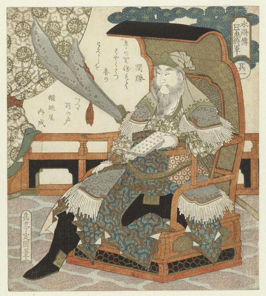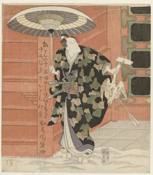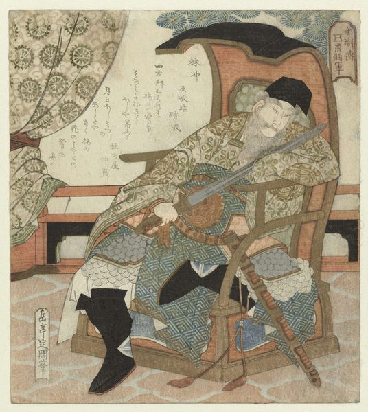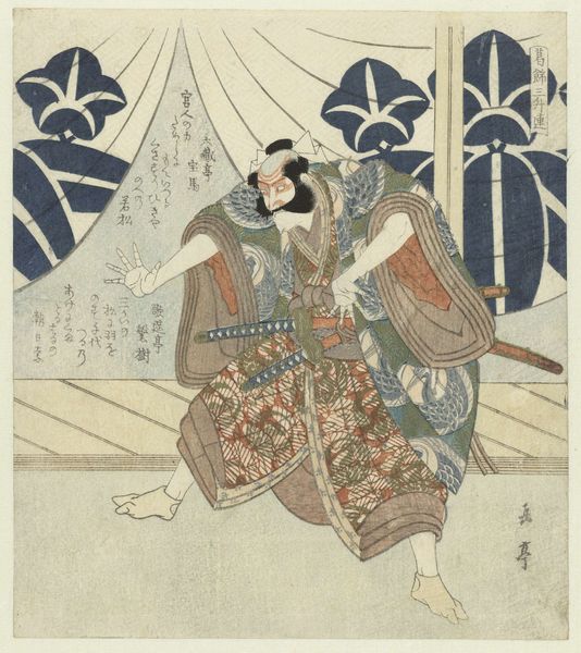 This woodblock print, titled "Soga no Gorô Tokimune" was created by Yashima Gakutei. The print presents a figure in a dynamic pose, set against a backdrop that merges abstract shapes with suggestions of traditional motifs. This immediately evokes a sense of both drama and stylization. The composition uses contrasting patterns and textures to create visual interest. The clothing of the central figure, with its intricate geometric designs, clashes subtly with the softer, more organic shapes in the background. The artist’s choice to flatten the perspective contributes to the print’s graphic quality, emphasizing surface design over spatial depth. The print challenges conventional notions of representation by blending elements of realism with abstraction. The tension between these opposing forces invites viewers to question the boundaries between representation and interpretation. Ultimately, the print serves not only as a visual spectacle but also as a meditation on the nature of art and perception.