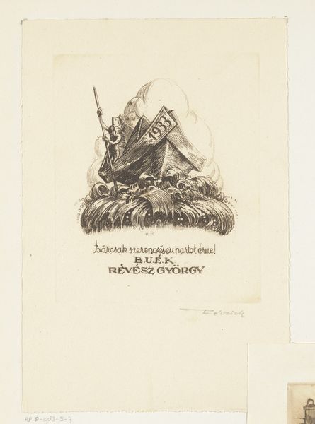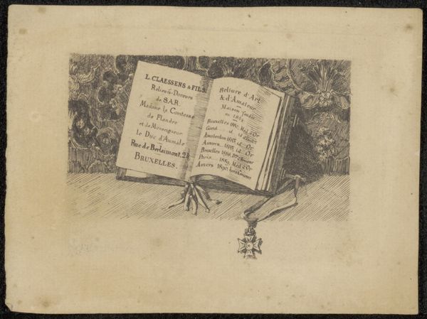Editor: This is "Visitekaartje van boekhandel C. Verrassel-Charvet te Brussel," a calling card for a Brussels bookshop made before 1894 by A. Verbeke. It's a print, so most likely an engraving or etching, featuring a very strange, almost goblin-like figure. What strikes you most when you look at this piece? Curator: Oh, isn't he deliciously unsettling? For me, it's the clever way Verbeke has animated the commercial world. Imagine Brussels then – a city steeped in tradition, yet yearning for modern amusements. This peculiar creature isn't just selling books; he’s selling a portal to another world! That mischievous grin hints at the scandalous caricatures and carnival costumes they offered, doesn’t it? Are we invited, perhaps, to partake in a little playful transgression? Editor: That's interesting! I was mainly focused on the weirdness of the character, but you're right; he does seem to be inviting us in on a secret. How does the visual style contribute? Curator: Notice the precise, almost fussy lines of the engraving. This level of detail adds a layer of both respectability and the grotesque, don’t you think? The meticulous script contrasts wildly with the fantastical figure, creating a delightful tension. It’s almost as if propriety is struggling to contain something wonderfully rebellious. Editor: I see what you mean! So, the image is playing with this tension between order and chaos. I hadn’t thought of it that way. Curator: Precisely! This was a time when artists used visual language to express and negotiate complex societal changes. It is playful and critical at once, like a well-written satire, really. Editor: Thanks, I now feel like I understand a little better the feeling of the epoch. I was lost only in its appearance!