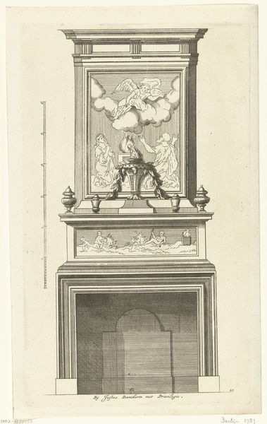 Cornelis Danckerts created this print of a mantelpiece, or "Onderboezem" as it's called in Dutch, using engraving. The symmetry and the structure of the design command our attention. The vertical emphasis creates a sense of grandeur, yet the composition is cleverly balanced with horizontal elements like the frieze and shelf. Note how the engraved lines create texture, and the figures in the frieze add a narrative element, like a classical scene frozen in time. The cherubs and garlands soften the formality of the structure. This design reflects the period's interest in classical motifs combined with the desire for ornate decoration. It challenges notions of plain functionality by elevating a common household feature to the level of art. Consider how the print, through its form, not only depicts an object but engages with ideas about status, taste, and the blend of form and function. As you leave, notice how the lines of the engraving create a complex image, illustrating the intricate and intellectual culture of the era.