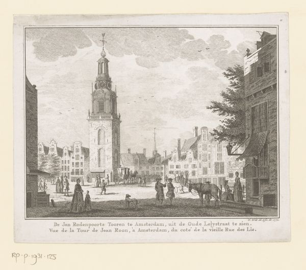 Curator: Before us is "View of the Old Fish Market in Haarlem," an etching created by Caspar Jacobsz. Philips in 1768. It resides, fittingly, in the Rijksmuseum collection. Editor: The striking tonal contrast of this Dutch Golden Age cityscape really pulls you in. The darkness of the church sharply contrasts the light that fills the marketplace. It definitely evokes a sense of bustling commercial activity. Curator: Precisely! Consider Haarlem in 1768 – a center of trade and civic life. This print offers a window into the daily lives of its inhabitants. Observe the figures populating the square: are they merchants, patrons, or are they simply people on their way somewhere? Their presence and their clothes contribute to a narrative about gender, class, and commerce. Editor: I agree. What stands out to me are the market stalls themselves. Etching allowed for precise replication of details like those canvas awnings, and the people seem actively engaged in some economic exchange. Look how the textures vary, stone compared to textiles. The choice of materials—copper plate, etching tools, the paper itself—reveal the hand of the artisan shaping perceptions of urban space. Curator: Absolutely, we can't overlook Philips' role in shaping perception! This etching provides a sense of ordered society – an idea important during the Dutch Enlightenment. Consider that Haarlem also bore witness to inequality and social struggles, and so this is also in many ways a performance. It invites reflection on urban experience through carefully constructed visual imagery, highlighting the ideal versus a potentially very different reality. Editor: The question of what to leave in, what to take out. It’s all part of how images reinforce a cultural or economic worldview. The choice of perspective and even what the weather looks like that day matters, doesn’t it? Looking closely at what is emphasized, it highlights the controlled production inherent in the Dutch art market. Curator: Looking at the legacy, one can ask: who has access to making history? Editor: That’s exactly where process connects to the broader political discourse, isn't it? The work reflects economic activity while also reflecting the values of the era. Curator: Well, the value here comes both from labor and insight into a historical microcosm. Editor: Definitely an efficient medium that tells a big story!