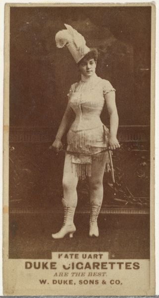 This photographic card of Kate Uart, Corsair Co. was produced by Allen & Ginter as part of a series of actresses featured on Virginia Brights Cigarettes. The sepia tone lends a nostalgic atmosphere, while Uart's theatrical garb, complete with feathered hat and miniature sword, presents a striking figure. Her pose is carefully constructed; the angle of her body, the placement of the sword, and the direct gaze create a dynamic tension within the limited space of the card. The composition employs a clear foreground-background structure, typical of staged portraits. Consider the semiotics at play here: Uart, the actress, is a signifier, her image tied to notions of beauty, performance, and consumer culture. The cigarette brand's name below becomes conflated with the allure of the actress, suggesting a convergence of fame, entertainment, and commerce. Ultimately, the card functions as a cultural artifact, a commercial object embedded with social meanings, reflecting the evolving relationship between art, advertising, and popular entertainment.