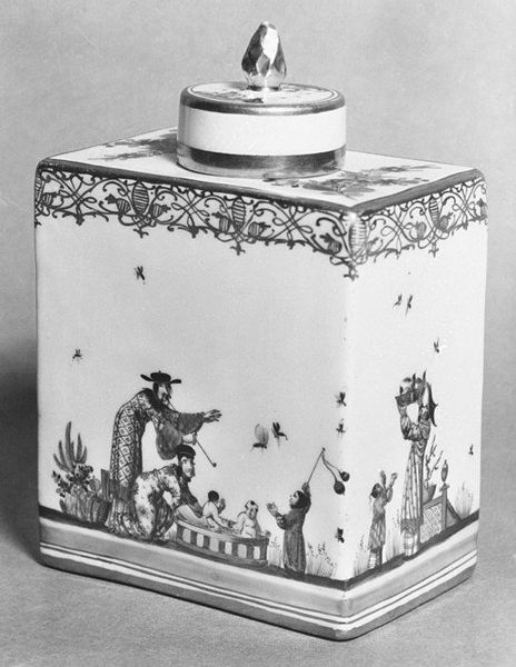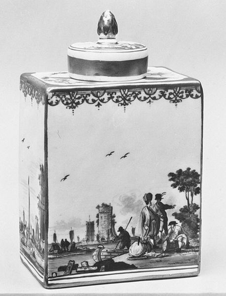 Curator: Let’s consider this "Tea Caddy" crafted around 1730-1740 by the Meissen Manufactory, currently housed at the Met. Editor: The tea caddy’s porcelain surface is captivating, adorned with miniature landscape paintings. The delicate porcelain hints at luxury. How might we interpret its purpose through its material existence? Curator: This tea caddy’s existence speaks volumes. Porcelain itself, at that time, represented global trade, colonial exploitation for resources, and the channelling of Chinese techniques through European labour. The decoration - these landscapes- might reflect a longing for the natural world amidst increasing industrialization and the labor involved in obtaining and consuming tea. Does the preciousness of the material itself elevate the tea or highlight a societal shift? Editor: So, the object’s materiality intertwines with labour and consumption in that era? It wasn't just about sipping tea. Curator: Precisely. Who had access to these luxuries? Who toiled to provide them? Think about the journey of the materials themselves. Where did the porcelain originate, and under what conditions was it crafted and distributed? The value and design became integral to its function. Editor: It gives a completely different lens to view the object, highlighting societal factors over mere aesthetics! I guess I didn't quite realise how informative the means of production can be in assessing the value of an object! Curator: Absolutely, viewing the tea caddy through this lens moves beyond surface admiration into critical cultural evaluation of class and consumption. Editor: Thanks for helping me appreciate this artwork on a deeper level, considering materials and the way they were made is insightful! Curator: It shifts our perspective to question not just what we see, but how the work came to exist within those economic structures, and how art production often obscures that production.