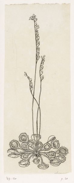 Curator: I’d like to introduce you to Willem Wenckebach’s “Pinksterbloem,” a pen and ink drawing on paper, created sometime before 1893. It resides here at the Rijksmuseum. Editor: My initial impression is one of delicate simplicity. The stark contrast between the black ink and the white paper gives it a very clean, almost botanical illustration feel. It feels more like a carefully executed study than a grand statement. Curator: Precisely. When we look at Wenckebach’s wider body of work, what becomes evident is his commitment to craftsmanship. The drawing itself is simple; the method of execution brings a new value to what is presented. Note how he doesn’t overly embellish, allowing the stark contrast and line quality to do the talking. His work across paintings, drawings and etchings reflects how artists engaged with varied production processes. Editor: It reminds me that even botanical art has never been apolitical. While it celebrates nature, it also reflects power structures. Think about how colonial botanical expeditions collected, classified, and often exploited plant life and Indigenous knowledge systems, or simply how land use becomes regulated and certain species prioritized due to classist concepts. Does this bloom represent a specific landscape, perhaps even a territory impacted by unequal relationships? Curator: An important question! Wenckebach lived through a period of massive industrial expansion. It's tempting to consider this drawing a quiet contrast, or perhaps even a gentle commentary on nature. It feels handmade, intentional – everything mass-produced items were not. Editor: Yes, but how might class factor into our reading? Is this rendering reflecting middle class values in rendering florals while the factory workers are making textiles with cheap and likely poisonous dyes that mimic botanical dyes from another continent? Curator: That's a complex but valuable consideration, especially as botanical drawings would become easily replicable designs for consumer objects, such as textiles. Editor: Viewing it today, "Pinksterbloem" evokes a sense of thoughtful elegance, making us reflect on the intersection of science, craft, and societal issues imbedded in floral displays. Curator: For me, it’s the careful hand and deliberate strokes that keep me returning to it, reflecting the artist’s commitment to his practice.