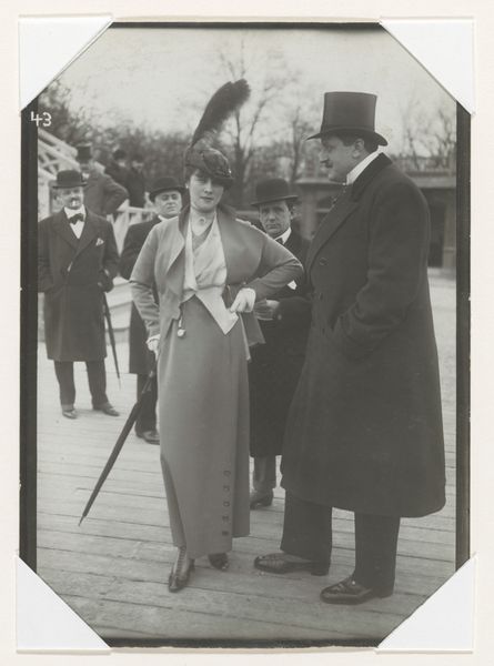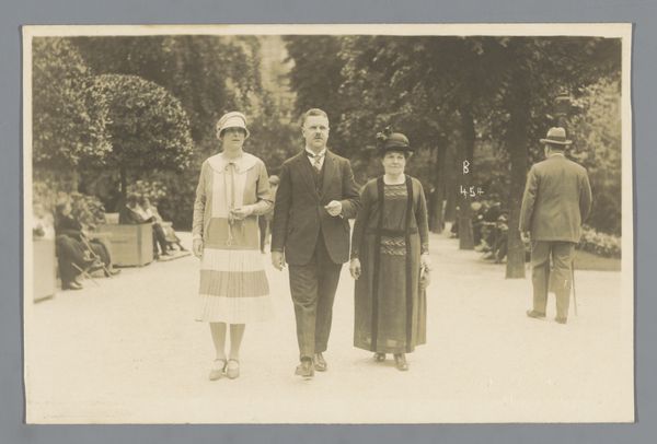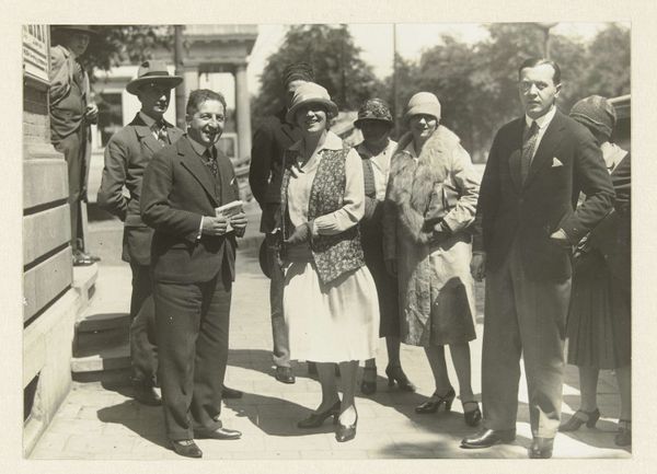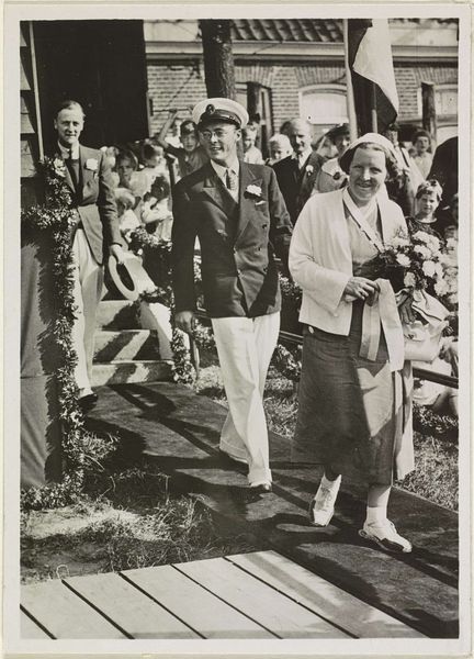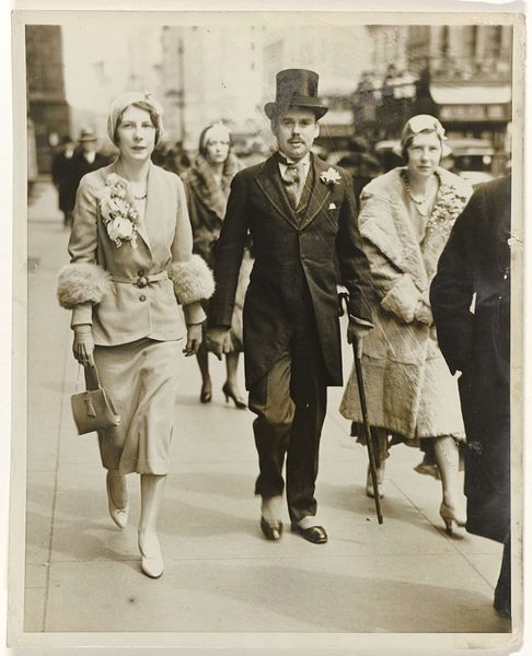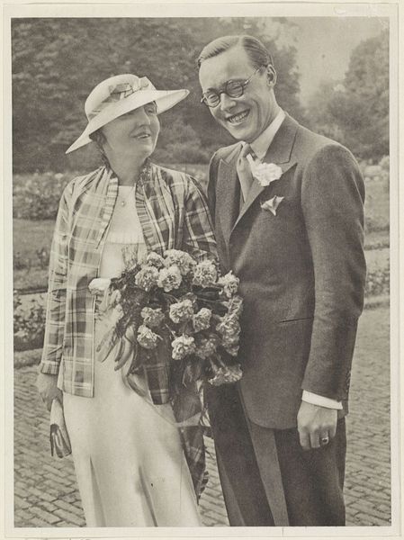 This photograph, taken in London on the 10th of August 1932 by an anonymous photographer, captures Ida-Teresa Conti and Han Harloff on their wedding day. In this period, photography had become a fairly accessible technology, yet it still carried a certain weight as a means of preserving important moments. The silver gelatin print process, which likely produced this image, required careful control of chemical reactions and skilled darkroom practice. The tonal range achieved speaks to the photographer’s expertise. Consider the clothing; the fabrics and tailoring represent a certain social class and access to specialized labor. The dress, likely machine-printed, hints at the increasing industrialization of textiles. Even the act of commissioning a photograph speaks to a desire to document and solidify social status. Therefore, the image invites us to consider the social context embedded in its making, challenging notions of photography as a purely documentary medium.