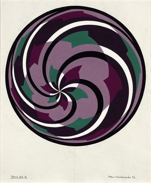 Editor: We are looking at Tadasky's "A 12" from 1962, executed with acrylic paint and ink. The contrast between the vivid yellow background and the concentric circles of purple is immediately striking. What is your perspective on the success of this composition? Curator: The formal elements within "A 12" operate on several levels. Note how the artist utilizes contrasting colors to create an almost palpable sense of depth and movement. The hard-edged quality speaks to a distinctly modernist sensibility, but how does the application of line and color complicate a reading of pure formalism, in your opinion? Editor: It is fascinating how the precision of the lines and shapes contrasts with the optical illusion of movement. The colors vibrate against each other! Does that suggest a challenge to the ideas of 'pure form'? Curator: Precisely! The tension lies in how the surface becomes destabilized. Though seemingly flat, the interlocking circular forms and their chromatic relationships push and pull the eye, defying any static reading. It is about the experience of seeing, about visual sensation achieved through pure form, even as that form seems to dissolve before our eyes. Editor: That's an interesting paradox! I was so focused on the image itself that I didn't fully consider how the optical effect enhances the viewing experience. Thank you! Curator: Indeed. By considering the push and pull of the formal elements, and reflecting upon our embodied perceptual experiences, we achieve a deeper understanding.