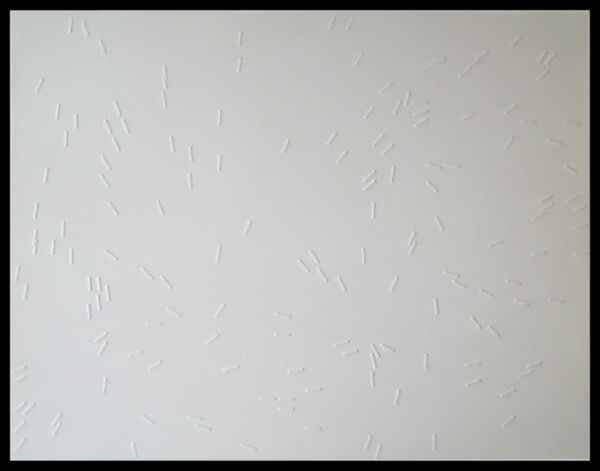Enrico Castellani's 'Superficie bianca' presents a field of systematic protrusions, a subtle yet compelling arrangement of dots across a seemingly neutral surface. This pattern evokes the ancient motif of the cosmos, recalling the star-maps of antiquity, where each point held significance in the cosmic order. Consider, for instance, the reappearance of the dot motif from prehistoric cave paintings to modern pointillism, each iteration carries a weight of accumulated meaning. In Castellani's hands, this archaic symbol is distilled, its spiritual resonance subtly transformed into a minimalist expression. Here, the subconscious desire to find order within chaos is made visual. The emotional power of the image lies in this tension—between the rational grid and the primal urge to map our place in the universe. The cyclical progression of the dot, from ancient symbol to modern abstraction, demonstrates how cultural memory persists, adapting and resurfacing across centuries, engaging viewers on a profound, subconscious level.