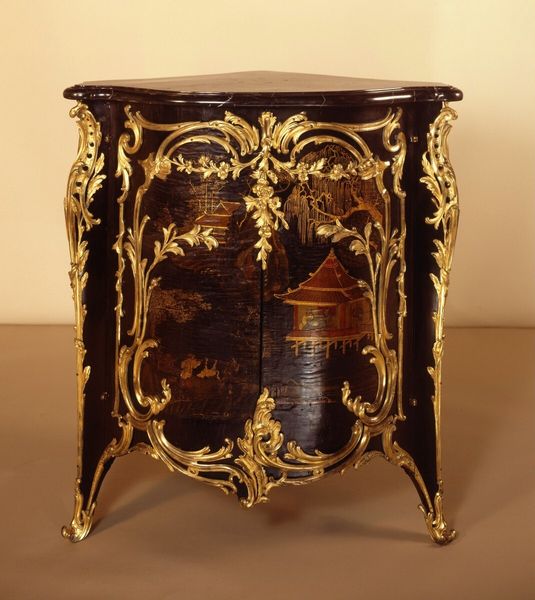 This commode was crafted by Jean Henri Riesener, showcasing intricate marquetry and gilt bronze detailing. The commode presents a symmetrical facade, where dark, lustrous wood surfaces are rigorously framed with bright, ornate metalwork. The marble top provides a cool contrast to the warmth of the wood, and the careful articulation of its form speaks to the refined aesthetics of its time. It is the visual interplay of these elements—the balance between restraint and opulence, the geometric clarity of the design against the organic patterns of the wood—that defines its character. Riesener’s work reflects a moment where structure and decoration engage in a delicate dance, indicative of the cultural codes which valued both elegance and order. In studying this commode, we observe not just a piece of furniture, but an embodiment of artistic and philosophical ideals.