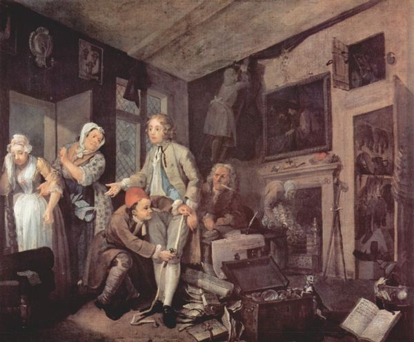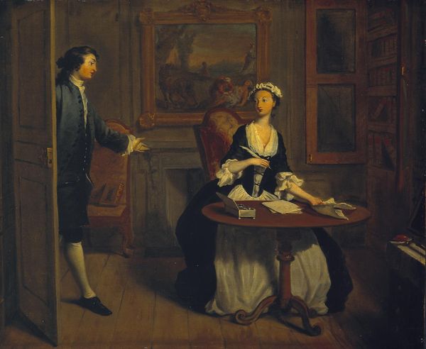 Curator: Ah, here we have "The Murder of the Count," an oil painting by William Hogarth, completed around 1745, part of a series currently residing at the National Gallery in London. Quite a scene, isn’t it? Editor: It’s a blood bath! Seriously though, the immediate impression is one of sheer chaos and desperation, underscored by that stark, almost theatrical lighting. It’s melodramatic, almost operatic, wouldn't you say? Curator: Very much so. Hogarth used narrative painting to satirize social ills and moral decay in 18th-century England, creating cautionary tales for public consumption. "The Murder of the Count," is one such story, reflecting anxieties around arranged marriages for social and financial gain. Editor: Right, I see it. That poor woman, kneeling, pleading--such vulnerability and that man climbing back through the window! What does that say, besides needing to find a better exit strategy, next time, maybe use the front door?! Curator: Precisely. He underscores the conspiratorial, secretive nature of the event, implying deception and social corruption, the breakdown of traditional family structures. It all adds to the moral commentary. Editor: The candelabra light casts sinister shadows across the scene and heightens the sense of horror, as does that deathly pallor of the count. Though maybe that's also the terrible wig. And a skull or two on the floor! That’s subtle! Curator: (Chuckles) Indeed. And consider the implications of placing that terrified woman in such proximity to that abandoned harpsichord—broken vows. The instrument also symbolizes status. This artwork really spoke to social anxieties in the 1700s. Editor: It's an extremely compelling, very disturbing look into that world, even now. Curator: It still begs the question, though: how do social changes lead to more social change in England and beyond? Hogarth's influence can be seen to this day! Editor: A vivid story, perhaps excessively so, reminding us that the old stories can be retold.
