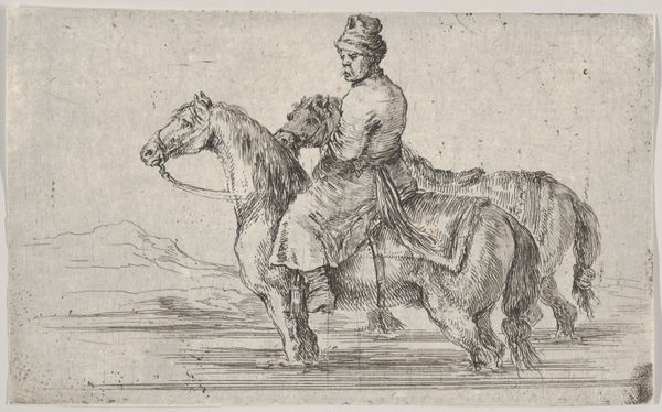 This etching presents us with a rider viewed from the front. Here, the horse and rider are not merely figures but embodiments of power and status. Consider the horse, a symbol of virility and nobility since antiquity, prancing with controlled energy. The rider, adorned in finery, asserts his dominance, yet the image resonates with an older archetype. Echoes of equestrian statues of Roman emperors or Renaissance condottieri whisper through the ages. But what is the emotional undercurrent here? The controlled posture of both man and beast speaks not only of power, but also of the restraint necessary to wield it. This is not a chaotic force, but a measured display, much like the images of Alexander the Great, whose portrayal on horseback became a potent symbol of leadership. Through such recurring motifs, history imprints itself upon our collective consciousness, resurfacing and evolving, shaped by the changing tides of human experience.