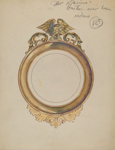 Curator: Ferdinand Cartier's "Mirror," dated 1936 and rendered in watercolor, gives off this air of faded grandeur. What do you see? Editor: Initially, I observe a fascinating study in classical formalism: a central circular void framed by elaborate ornamentation and symmetrical accoutrements. It suggests both absence and potential presence, quite intriguing. Curator: I'm captivated by how Cartier employs the eagle motif; perched atop, regal, almost oppressive. Does that strike you as an assertion of power, perhaps a reflection of the era it was made in? Editor: Undeniably. The eagle functions as a clear signifier of authority and imperial bearing. The meticulous detail and balanced composition—mirror flanked by candelabras, topped by the commanding eagle—speak volumes about control and deliberate aesthetic intent. It flirts with semiotics! Curator: The choice of watercolor, so delicate, juxtaposed against such grandiosity... Do you find it undermines or strengthens the overall impact? I always wonder. Editor: A pertinent observation! Watercolor allows for subtle gradations, softening the rigid neoclassical structure, almost inviting a ghostly presence to inhabit it. Its translucence lends an ethereal quality. That eagle though! It’s so imposing, that softening doesn’t entirely convince me. Curator: For me it evokes an imagined space. Like a vignette glimpsed in the reflection—something both familiar and impossibly out of reach, even if just a little! Editor: An enticing concept! It is the symmetry, however, that grounds it for me; a strictness that reminds us how much calculated design goes into what might first appear effortlessly beautiful. I appreciate Cartier’s play between constraint and decorative abandon. Curator: Agreed! Seeing it again has shifted my thinking somewhat too – it feels less imposing now, more like an open question of form. Thank you. Editor: My pleasure! It reinforces my appreciation for how artworks like this compel continued close visual investigation, constantly yielding fresh insights into historical, cultural, and aesthetic meaning.