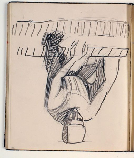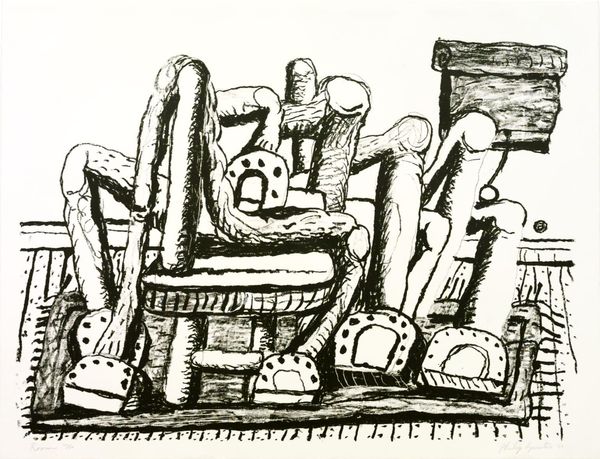 Editor: Here we have Philip Guston's "Studio Corner." The stark black ink on white creates a rather unsettling atmosphere, even though it depicts everyday objects. What historical context might illuminate Guston's choices here? Curator: Consider Guston's renunciation of abstract expressionism in favor of this representational, cartoonish style. It was a period of great social upheaval, and his return to figuration can be seen as a political act, rejecting the perceived elitism of abstraction for a more accessible, albeit disturbing, visual language. Editor: So, the simplicity is a statement in itself? Curator: Precisely. He embraced a seemingly crude style to confront complex social issues directly, reflecting a broader cultural shift towards demystifying art and engaging with the everyday struggles of society. It challenges the established art world. Editor: I never thought of it that way. Seeing it as a political statement really changes how I understand the piece.