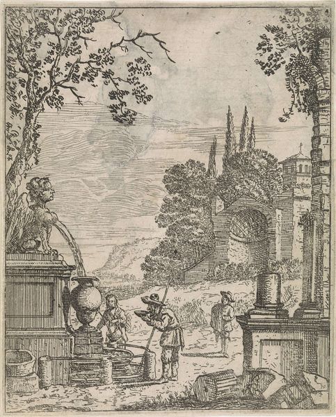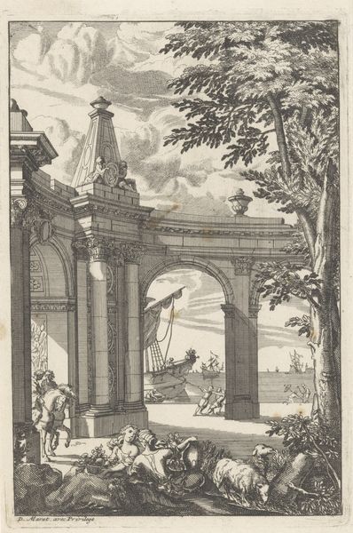 Editor: This is "Landscape with classical sculptures and buildings" by Isaac de Moucheron, created sometime between 1677 and 1744. It's an ink and pen drawing. There is such a sense of constructed grandeur, almost like a stage set. How do you read this landscape? Curator: It's a fascinating tableau, isn't it? Moucheron is very deliberately constructing an image of an ideal past, drawing heavily on classical architecture and sculpture. We must consider this in light of the rising merchant class. Editor: What do you mean by this being reflective of a rising merchant class? Curator: Well, this idealized vision of antiquity, particularly Roman antiquity, becomes incredibly fashionable. The wealthy merchant classes were eager to display their knowledge of and association with the refined, ordered world suggested by classicism. Landscape paintings like these acted as status symbols, markers of cultural capital, and helped legitimize their new positions of power. Editor: So, it's about more than just pretty buildings. It's about making a statement? Curator: Precisely! It’s about inserting themselves into a historical narrative, linking themselves to the power and prestige of the Roman Empire. Think of it as early modern social climbing through visual culture. Notice the seemingly casual arrangement of figures? It suggests an effortless familiarity with this constructed world. A cultivated ease, available to the discerning eye - and wallet. What do you think of the placement of the ship on the horizon? Editor: I hadn't really considered it much before, it now feels as if the new modern (the boat) is tied directly into the historical legacy as represented by the Roman architectural remnants in the work. Curator: Yes exactly, so in short, beyond just artistic merit, this work encapsulates a social and political ambition very characteristic of the time. Thank you, I see it differently myself, now. Editor: Absolutely, and now I'm viewing this idyllic landscape through a whole new, much more interesting, lens.