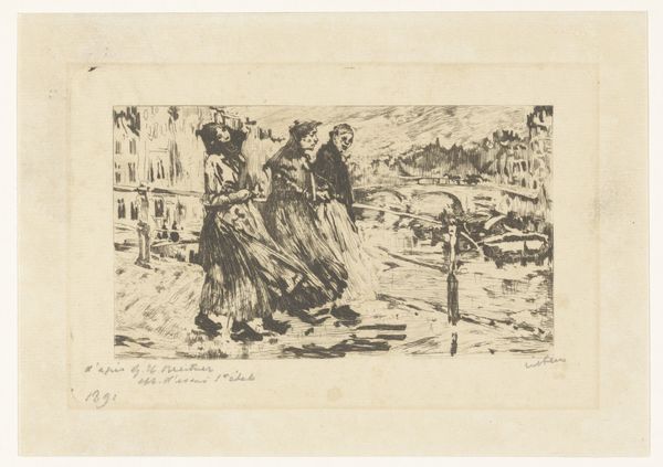Curator: This is "Drie vrouwen op een brug in regen en wind," or "Three Women on a Bridge in Rain and Wind," created by Willem Witsen in 1891. It currently resides here at the Rijksmuseum. Editor: My first thought is melancholy. The monochromatic palette and blurred lines create such a sense of dampness and gloom. They really convey a dreary, hard life for the women depicted. Curator: Absolutely. Witsen came from a wealthy family and was deeply engaged in the cultural and social life of Amsterdam, and, through that engagement, this work reflects the societal contrasts between the wealthy and the working class at the time. These women, their postures and clothing suggest a life removed from the comfortable bourgeois existence. Editor: I see that, especially considering how he renders their figures – slightly stooped, almost blending into the misty environment. Their faces are obscured, devoid of individual identity, representative of a broader, often overlooked demographic. It is as though they are being erased by the rain itself. It is the patriarchy's affect on a class struggle. Curator: Right, there's a clear artistic decision here. Witsen's work often captured cityscapes and landscapes, but here he intentionally places these women as subjects, not merely as incidental figures. It elevates their presence while simultaneously highlighting their struggle against the elements, their struggle in Dutch society, perhaps. Editor: I also notice how the bridge functions symbolically, a crossing, perhaps. Is it a transition from one stage of life to another? Is there an element of journey here? Are they leaving something behind? What were these women's options? The weather seems like the least of it. Curator: That reading resonates with the social realities of women in that period. Their lives, opportunities, and movement were often literally and figuratively restricted by societal norms and economic realities. I see a narrative being communicated about their lived experiences that speaks to that. Editor: It's haunting and thought-provoking, this piece. It makes you question who gets remembered, and how, in history, especially considering it's crafted by a man. Curator: Indeed. It prompts us to delve deeper into the historical context, challenging us to examine power structures embedded in both art and society. Editor: Absolutely. This engraving leaves me pondering not only the lives of these women but the untold stories of so many others rendered invisible by historical narratives.