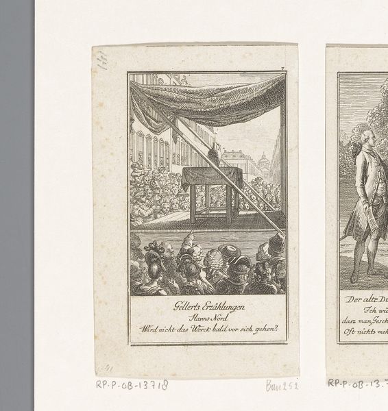 Daniel Nikolaus Chodowiecki created this print, 'Actie bij Amstelveen op 1 oktober 1787,' using etching. The composition’s most striking element is the stark contrast between the chaotic foreground and the smoky, ambiguous background. Chodowiecki’s use of line is particularly important here. Notice how he employs delicate, precise lines to depict the figures and horses. The detailed rendering of the soldiers and their mounts contrasts with the more loosely defined background. This background is filled with smoke and vague architectural forms, creating a sense of depth and disorientation. The dynamism inherent in the diagonal lines of the fallen figures and rearing horses adds to this sense of instability. The print captures a moment of political upheaval. It uses formal techniques to create a sense of chaos and uncertainty. This destabilizes any clear, singular interpretation. Instead, the artwork invites viewers to grapple with the complexities of conflict. It prompts reflection on the fragile nature of order and authority.