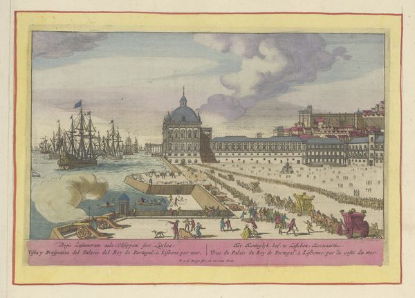 Curator: What a charming vista. We’re looking at a print called "Gezicht op de Pont Neuf over de rivier de Seine te Parijs, gezien richting de Pont Royal", dating somewhere between 1742 and 1801 and created by Georg Balthasar Probst. It depicts a view of the Pont Neuf in Paris, looking towards the Pont Royal. Editor: It's lovely, a bit dreamlike even. The gentle watercolor washes give everything a softened, almost hazy appearance. The composition is very balanced, drawing the eye deep into the cityscape using the river as a guide. Curator: Indeed. The perspective, though perhaps not mathematically perfect, is ingeniously employed. We can use this engraving to analyze urban power structures. Note the placement of the equestrian statue, probably a monarch. Who is truly served by this beautified view? What classes are most represented here and who might be absent? Editor: I'm drawn to the detailed rendering of the architectural elements, the facades of the buildings meticulously outlined. The subtle shifts in color within the water and the sky give depth, an attention to form over pure surface-level detail that really pulls you in. It looks so technically pristine for that period. Curator: And technically pristine for the privileged classes who benefited from that aestheticization. It is easy to become lost in its pleasing artistry, but the reality of urban inequalities needs to be recognized. Those carriages represent an economic stratification with very little vertical mobility available. We are experiencing an aspirational visual for the haves at the expense of the have-nots. Editor: That may well be, but look at the confident application of line. Probst clearly understood how to use light and shadow to create volume and interest. To reduce it to simply a depiction of economic disparities seems a disservice to its formal qualities. Curator: Perhaps, but the aesthetic cannot be divorced from the sociopolitical context in which it was made and consumed. Looking closely reveals more profound truths, you just have to change the frame a bit. Editor: Well, I will definitely ponder the historical implications that you point out, while still marveling at how effectively the artist captured a sense of place with limited artistic means.