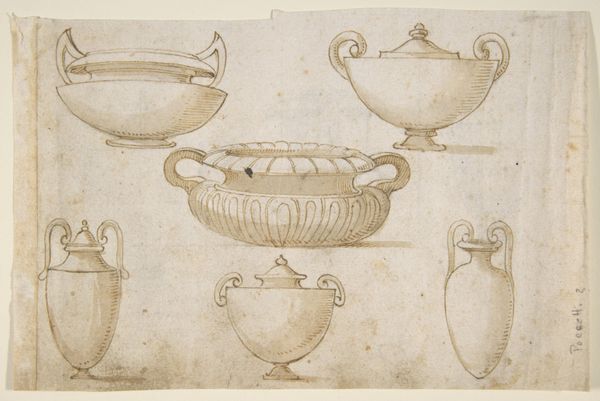 Curator: Oh, I'm immediately drawn in. It's like stepping into a fragrant, imagined Renaissance workshop! Such elegant potential rendered in soft shades. Editor: Indeed. What we're observing is "Design for Shallow Two Handled Dish and Four Perfume Bottles," an ink, pencil, and wash drawing on paper by Erasmus Hornick, likely created between 1500 and 1583. The designs themselves offer a window into the artistic and social life of the Renaissance. Curator: Renaissance chic, distilled. Those perfume bottles! Each one feels so distinctive, almost characters in a silent play. You can almost smell the concoctions they'd hold – myrrh and ambergris, perhaps. I see that Hornick even notates two of the bottles. Did this work serve some grand purpose beyond just eye-catching aesthetics? Editor: Undoubtedly. Hornick was an important goldsmith and printmaker, so designs like this would have been patterns for other artisans. They reveal a sophisticated market eager for luxury items – objects that performed refinement, wealth, and perhaps even an aura of mystery. I find it remarkable how detailed this sketch is, considering its intended function as a template for future objects. Curator: He’s conjuring the very essence of the vessels! Not just what they look like, but almost their potential energy. It’s interesting how the print itself becomes an object of beauty. How did designs like this shape the field, and impact design production in society, though? Editor: Drawings and prints such as Hornick’s filled pattern books that circulated among workshops across Europe, informing a shared visual language, influencing trends in ornamentation, and even affecting diplomatic exchanges and competition. Prints made luxury designs accessible across great distances, facilitating artistic cross-pollination. Curator: That makes me look at it so differently. Each of those delicate lines, multiplied and mirrored across workshops, and societies, a whispering influence shaping taste! The objects he renders probably sparked just fleeting pleasure or personal vanity, while the sketch had an influence, a voice, of its own! It's wonderful that it's here for us to appreciate today, to recognize a lasting imprint through form. Editor: Yes, it invites us to consider the complex, interwoven threads of art, commerce, and social status in Renaissance culture, and it reminds us of how drawings operate both as utilitarian templates, but can transcend beyond design itself, with lasting social reverberations.