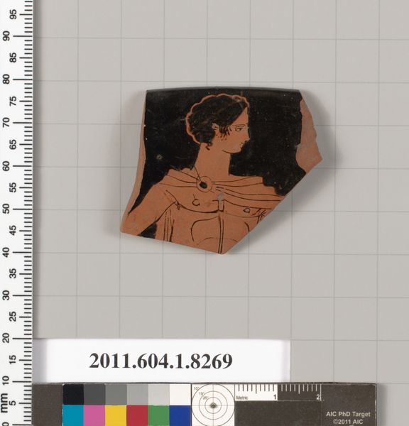 Curator: Here we have a terracotta rim fragment of a kylix, or drinking cup, crafted around 530 BC and attributed to Hermonax. Editor: The black background and the figures depicted in what looks like red-figure technique immediately gives it a dramatic flair. Despite being a fragment, the expressiveness is captivating. Curator: Absolutely. Kylixes, objects of daily life, also served as canvases for social narratives. Consider the labor invested here—shaping the clay, meticulously painting the figures, controlling the kiln firing process to achieve that glossy black. The red-figure technique, developed around this time, essentially reverses the older black-figure style. The fine lines define the figures. Editor: I'm thinking about its place in Athenian society. A drinking cup used during symposia, social gatherings that reinforced hierarchies and expressed cultural values. What can this specific imagery, incomplete as it is, tell us about the rituals and stories circulating then? Curator: Exactly. We can speculate on the figures themselves—their gestures, what remains of their garments. Were they revelers, athletes, mythological characters? It’s also compelling to ponder what these vessels meant for social interaction and class divisions during this period. Editor: Thinking of that access, did such elaborate ceramic ware ever trickle down to broader Athenian society or was the consumption primarily restricted to the elite? Curator: While mass-produced pottery certainly existed for the everyday citizen, pieces with detailed artistry likely marked a display of affluence and sophistication within particular social circles. And we should never disregard the importance of their context within religious rituals. The drinking parties were commonly religious events and kylixes themselves had votive purposes. Editor: The fact that it is only a fragment complicates any comprehensive conclusion, and yet allows a tantalizing glimpse into the craftsmanship and social structures of its time. Curator: Precisely. This seemingly simple drinking cup opens to a range of critical investigation into material culture and symbolic meaning during that particular historical moment.