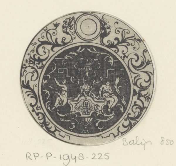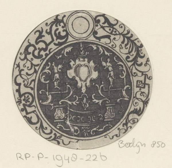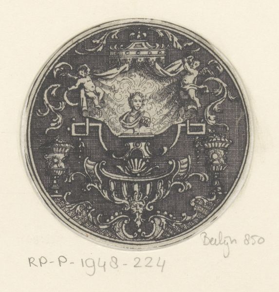 This circular piece, titled "Cirkelvulling met engelen op voetstuk," was rendered anonymously using an unknown medium. Notice how the composition is structured around a central, ornate pedestal. The artist employs a dense network of fine lines to create a sense of depth, texture, and hierarchical arrangement. Linear patterns of ornamentation create a symbolic language of power and divinity. The circular format, reinforces themes of unity, infinity, and the cyclical nature of life. At the top, a body lies in state, flanked by draped figures, while standing figures hold staves. These classical motifs are destabilized by the playful cherubic figures. The semiotic interplay between the classical and the cherubic subverts traditional expectations. This piece challenges fixed meanings and invites ongoing interpretation, using form as a conduit for cultural and philosophical discourse.