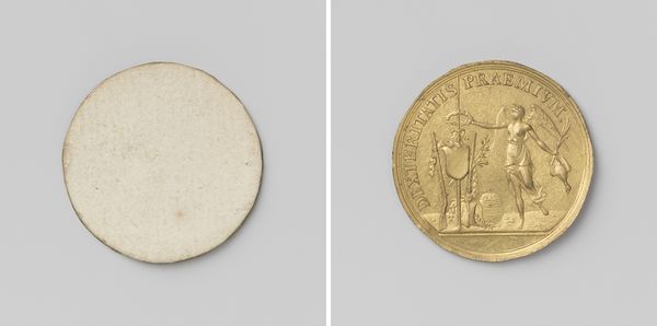 Curator: Here at the Rijksmuseum we have a bronze commemorative medal titled "Overlijden van Stadhouder Prins Willem IV 1751," made by Johan George Holtzhey in 1751. Editor: The piece strikes me as stark. The lack of a polished finish, almost raw in its execution, contributes to a severe, even mournful mood. What details are important here? Curator: Certainly, the profile portrait. It’s encircled by an inscription—a kind of epitaph in Latin which directly translates to, "Thus he wished to be represented to posterity, and he merited it". The halo-like cluster of stars directly above William’s head reinforces his elevated status. The deliberate use of the Latin language also connects us with ancient notions of heroic figures of state. Editor: Interesting. The inscription does set the parameters of the man's representation, which invites us to consider the material itself, this weighty bronze, almost sculptural, not painterly or graphically evocative as portraiture can often be. There are two sides presented here too... a before and after in a sense. One carefully tooled, one not at all. Curator: Exactly! And don’t forget this object's nature; this wasn’t a portrait for intimate display; it was designed to be distributed, passed on, literally circulated in order to fix and promote his image after his death. In effect, his persona became communal cultural property. Editor: Given that it commemorates a death, there’s an unusual quietude here. The carefully positioned text around the portrait, the way he's looking... not heroic, but reflective. One might almost miss the propaganda purpose beneath its dignified calm. And is that back side supposed to signify anything to me, in your eyes? Curator: It is more than possible that the roughness on the back may indeed express what remains. The lack of detail can reflect on death as what remains; nothing. On the other hand, it gives one a clean space to hold; it becomes very functional. Editor: Yes. Considering both sides like that, one about control of narrative, the other about raw potential. It's an artifact packed with paradox, designed both to celebrate a leader and to remind us, perhaps, of our shared fate, if read with its reverse as a part of its wholeness of expression. Curator: I appreciate your close read; understanding its intent along with appreciating its creation enables a greater comprehension and meaning within its social environment.
