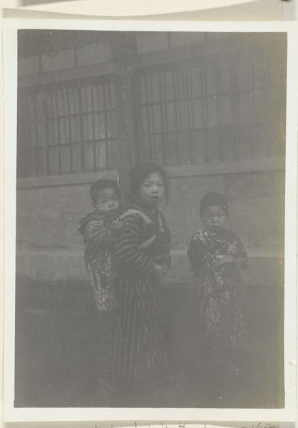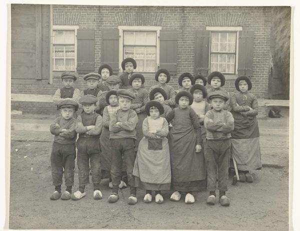Editor: This is a gelatin-silver print, dating roughly from 1860 to 1915, titled "6 Kinderen (met opdracht aan mevr. Ingenohle)," or "6 Children (with dedication to Mrs. Ingenohle)," created by Firma F. Hisgen. I am immediately drawn to the almost symmetrical composition and how the subjects' dark garments contrast with the faded backdrop, which adds depth. What stands out to you from a formalist perspective? Curator: Indeed, the photograph's power resides in its deliberate construction. Observe the arrangement of the children: a gradual rise and fall in height creating a rhythmic line across the frame. This linear quality is further accentuated by the slight variations in tone – from the lighter dresses on the ends to the darker clothing worn by those in the center, establishing a compelling visual hierarchy. How do you see this contrast working? Editor: Well, the shift from light to dark and back again makes my eye move back and forth; it makes the image more dynamic despite the still poses of the children. But doesn't the backdrop also play a part, perhaps even distracting from the main subject? Curator: I understand the sense of distraction. But let us consider the background as a formal element. Its haziness diffuses light, placing focus back on the tangible forms of the children. This contrast between focus and diffusion further enhances the photograph’s structural integrity, don't you agree? It draws the eye to specific points of clarity. Editor: I think so, I didn't think about it as a balance between clarity and diffusion; I focused more on just seeing it as distracting and 'unclear'. Curator: Exactly! Examining photography through its inherent components—contrast, tone, and line—uncovers the carefully-constructed dynamics within. It shifts the emphasis away from immediate historical context and instead celebrates internal relationships of photographic structure. Editor: Thanks for elucidating this. I can now see the structural ingenuity and visual rhythm Firma F. Hisgen achieved within a formal language!