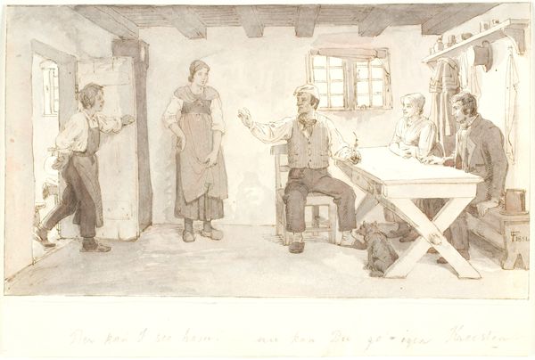 Jos Wins made this watercolor painting depicting a barn interior with men conversing, but we don't know exactly when. Watercolor gives the painting a soft, diffused quality, allowing the artist to capture the play of light and shadow within the rustic space. The washes of diluted pigment create a sense of atmosphere, evoking the dampness and coolness of the barn. Wins skillfully uses this medium to depict the textures of the rough-hewn wooden beams, the hay on the ground, and the various implements scattered throughout the space. By focusing on the interactions of these figures amidst the tools of labor, Wins’s painting speaks to the social fabric of rural life, challenging conventional hierarchies between labor and leisure, craft and fine art.
