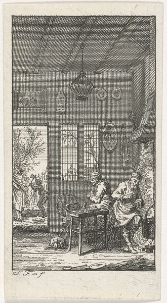 Editor: Looking at this etching, called "The Director" by Nicolas Joseph Voyez, I’m immediately drawn to the incredibly detailed depiction of fabrics. The way the light falls on the different textures makes me wonder about the process of creating this print. What story about production and consumption do you see in this work? Curator: Excellent observation! Focusing on the materiality here, the very act of etching itself – the skilled labor, the copper plate, the paper – speaks to a specific kind of production, a reproduction available to a certain class. Think about the market for these prints: were they widely circulated, or were they luxury items, further cementing class distinctions? The depiction of such elaborate costumes points to a society obsessed with appearance, consuming textiles at a furious pace. Editor: So the print itself is a commodity reflecting the consumption it depicts? Is the material valuable? Curator: Precisely! And look at the scene: a gathering in what appears to be a well-appointed room. Consider the cost of furnishing such a space, the social labor involved in producing these objects, the woodworker who crafted the chair or the glassmaker who fabricated the mirror in the background. Everything on display becomes part of a cycle of production, value and exchange. Do you think that's something the artist tried to put forward? Editor: I hadn’t considered all of that! It’s like the image is a microcosm of the entire economic system. Curator: Absolutely! And the “Director,” presumably orchestrating this scene in some way, is perhaps emblematic of those who control the means of production or enable trade. A celebration of the industrial processes but also perhaps a study of inequality that occurred as a result of that production and consumption? Editor: It's fascinating how analyzing the material aspects of the print, and the depicted environment, opens up entirely new perspectives on this image. Thank you! Curator: My pleasure! Focusing on materiality allows us to unearth the often-hidden histories embedded within works of art.