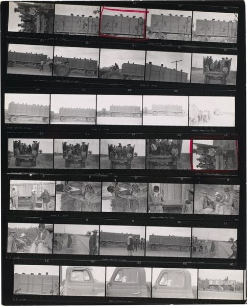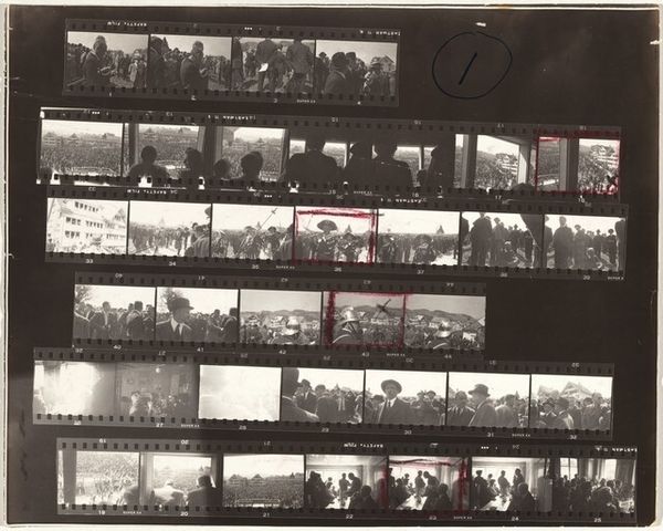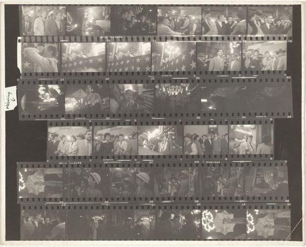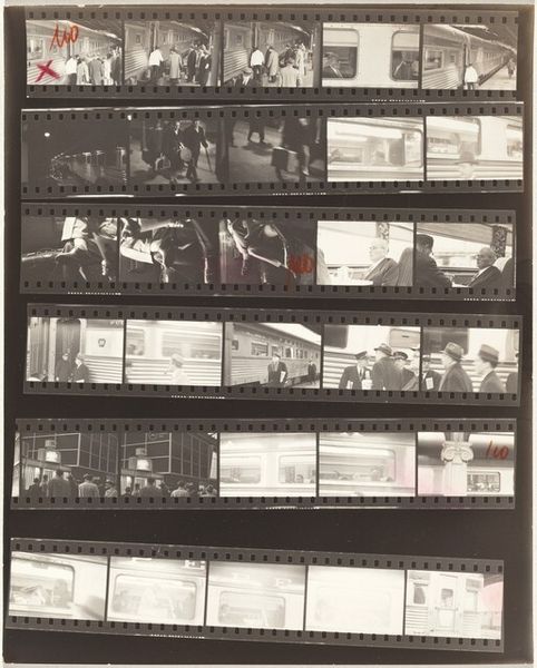 Curator: Let’s spend some time looking at Robert Frank’s piece, “Family and Edouard Boubat—New York City no number,” a gelatin silver print from 1953. What are your first impressions? Editor: Fragmented, almost like a contact sheet from a film roll. The tonal range is limited but compelling, drawing you into each individual frame even as you’re aware of their arrangement as a whole. Curator: Frank was Swiss-American, and part of the New York School of photographers. He’s really known for his raw, seemingly spontaneous style which, at the time, was a stark departure from the carefully staged photography so popular in the 40s and 50s. This particular work gives us an interesting behind-the-scenes peek. Editor: The sequencing definitely provides a narrative. You see moments both public—crowds on a busy street—and private, with individuals at a cafe or examining pictures hung on the wall. The contrasts feel intentional, right? Curator: Absolutely. This work emerged during a fascinating period. There was growing disillusionment with the post-war American dream, simmering beneath the surface of the supposed consensus culture. Frank captured that unease. It’s also worth noting he originally intended this as a preliminary layout for a book, before it evolved into an artwork on its own. Editor: The composition highlights that tension perfectly. The gritty, unglamorous aesthetic undermines any sense of idyllic domesticity. The tight cropping almost feels voyeuristic in sections. Curator: Frank certainly challenged prevailing norms, both artistically and socially. His lens captured ordinary Americans, often overlooked, and it did so in a way that resonated deeply with the burgeoning counterculture. He was criticized, of course, for portraying a negative image of America, but that’s exactly what made his work so revolutionary. Editor: It’s funny, though, seeing this now. You see a rejection of aesthetic traditions on one level, but also the employment of pictorial structure at another, like an anti-aesthetic gesture performed using purely aesthetic means. Curator: Well, I’d argue that Frank's 'negative image' wasn't just about exposing problems, but humanizing everyday struggles. He provided a visual vocabulary for understanding the complexities of American life at the time. Editor: A fascinating visual document and, ultimately, an example of brilliant composition within limitation. Curator: A potent reminder of the power of art to reflect, critique, and shape our understanding of society.