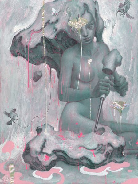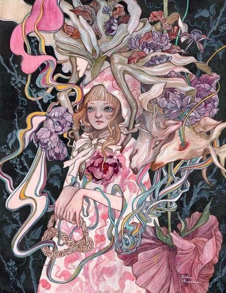 James Jean made Chelone and I want to swim in it. The way Jean moves between super-fine detail and luscious washes reminds me of being underwater, where everything is close up and far away all at once. Look at the waves around the figure, each line so precise and deliberate, and then see how the colors soften and melt as they reach her skin. It’s as if the waves are both real and dreamlike, solid and ephemeral. Notice the mark-making on the shell or rock behind her, how the lines build up in layers, creating depth and texture. This area has a really nice combination of control and freedom, a balance that gives the whole piece its energy. Jean makes me think of Aubrey Beardsley, another artist who knew how to make the line sing and move, but Jean’s colors bring it all into the present. Art is just one big conversation, isn’t it?