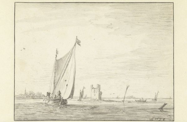 Jan Izaak van Mansvelt created this etching, Riviergezicht met schepen, or River View with Ships, in the Netherlands around the late 18th century. It offers a glimpse into the bustling maritime life of the time. Notice how the composition is divided, with a large sailing ship dominating the left and smaller boats populating the river leading back to a windmill. The image creates meaning through the contrast between the large ship, likely used for trade or transport, and the smaller fishing boat in the foreground. This contrast speaks to the economic activities and class structures of the Dutch Republic, where maritime trade was a central feature of life. To understand this artwork, we might look at economic histories of the Netherlands to learn about the complex relationships between trade, fishing, and land use. By studying the historical context, we can better understand how Mansvelt’s image reflects and comments on the social structures of his time.