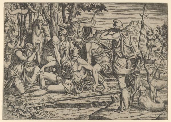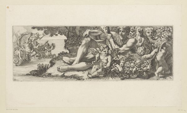 Pierre Milan created this engraving titled "Dance of the Dryads" sometime in the mid-16th century. The print depicts a circle of nude or semi-nude female figures, dryads, dancing in a ring under a tree. Milan lived and worked during the late Renaissance, a time marked by a renewed interest in classical antiquity. This is visible in the idealized forms and mythological subject matter, as dryads were understood as the spirits of trees in ancient Greek mythology. The print also reflects the male gaze dominant in art of the period, where the female nude was often presented for the pleasure and consumption of a male audience. The dryads are depicted as beautiful and sensual beings, embodying both fertility and the allure of nature. Yet the dryads in their dance also evoke a sense of freedom, existing outside the boundaries of civilization. The tension between the objectification of the female form and the celebration of female agency is what makes this print so emotionally complex and compelling. "Dance of the Dryads" thus provides a lens through which to consider the dynamics of gender, power, and representation that continue to shape our understanding of art today.