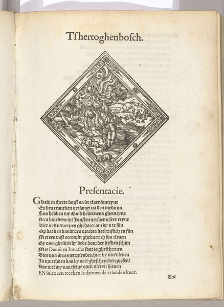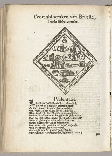 This anonymous print from 1561, titled "Vertoning van De Peoene (Mechelen)," presents a structured composition encased within a diamond frame. The linear precision of the engraving emphasizes the figures and the surrounding landscape, rendered in monochromatic tones. This use of line and form evokes a sense of classical order, contrasted by the allegorical scene depicted. The imagery, rich with symbolism, invites a semiotic reading. The central figure, possibly a personification of virtue or a mythological character, holds a flowering branch, a visual signifier of growth and prosperity. This central figure is surrounded by secondary figures, with the overall structure creating a balanced, yet enigmatic narrative space. The very structure of the diamond shape, with its sharp angles, destabilizes a traditional narrative by presenting it within a non-conventional frame. The print challenges fixed meanings, operating within a visual language that merges classical form with allegorical content. This fusion reflects broader artistic and philosophical concerns of the era, where visual art served as a medium for intellectual discourse. The formal qualities of the engraving, therefore, are not merely aesthetic but indicative of a larger cultural dialogue.