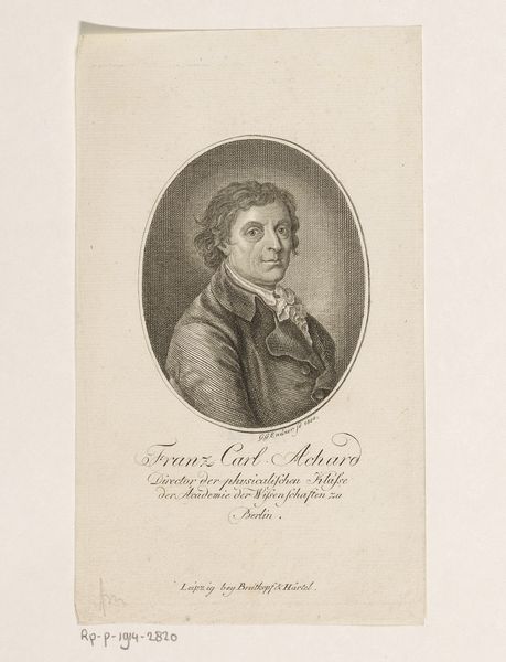 This is a small portrait of Franz Carl Achard, whose artist is unknown. It is rendered in print, achieving a meticulous level of detail through intricate linework. The oval composition, crowned with a decorative ribbon, gives a sense of formality, typical of its era. The texture in this portrait is fascinating; it’s rendered entirely through a network of fine lines and stippling, creating a tactile quality that contrasts with the flatness of the print. The formal structure of the portrait, with its emphasis on symmetry and precise detail, is not just aesthetic, but a way of asserting control and order over representation. Consider how the very act of creating such a detailed likeness speaks to power structures and representation, inviting us to think about how images create and reinforce cultural values. It reminds us that art is never neutral; it’s a constant negotiation between the artist, the subject, and the viewer.