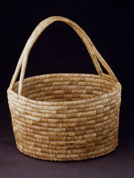 Curator: Before us stands an exquisite hexagonal bamboo basket, created around the early 20th century, crafted by Tanabe Chikuunsai. Editor: Wow, what a beautiful little beast! There's such patience, such a calm strength in those interwoven fibers. Curator: Indeed. The texture itself, the materiality of the bamboo, speaks to a deep understanding of form and function. Consider the hexagonal base and the way the structure ascends to a circular opening, a synthesis of geometric principles. Editor: It's earthy but ambitious. Makes me think about gathering things. Flowers, obviously, but also ideas... secrets! The handle is such a confident curve. Did they use it for tea ceremonies, or everyday grocery trips? Curator: While its practical application isn’t precisely known, its cultural context places it within the Japanese tradition of elevated craftsmanship, where utilitarian objects become imbued with artistic and spiritual significance. Note the complex weaving patterns that form the main body. Editor: Patterns inside patterns... It’s mesmerizing. Each intersection creates a shadow, another mini-hexagon lurking. Like hidden doorways in a fairy fort! Seriously, there’s an energy to it, almost like I can smell the damp earth and sunshine on the bamboo. Does the choice of hexagon have specific symbolism? Curator: The hexagon as a shape, particularly within traditional crafts, speaks to a striving for balance and harmony, representing, if we wish to consider semiotics, a kind of perfect organization found in nature itself. Editor: Hmmm, makes sense. The structure almost defies gravity with the amount of open space, but it still feels grounded. Something both precious and wonderfully resilient about that... Curator: I agree. We find here a profound aesthetic dialogue between the natural world and the refined sensibilities of Japanese artistry. It's a fascinating piece for visual analysis. Editor: Right? Like a little poem woven from sunlight, patience and maybe, just a dash of quiet rebellion.