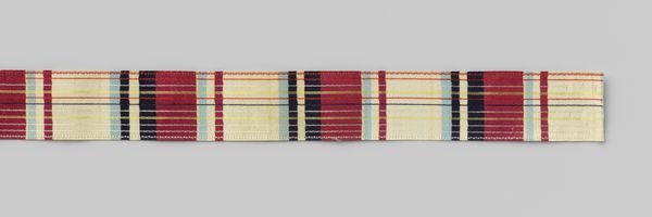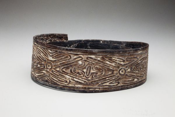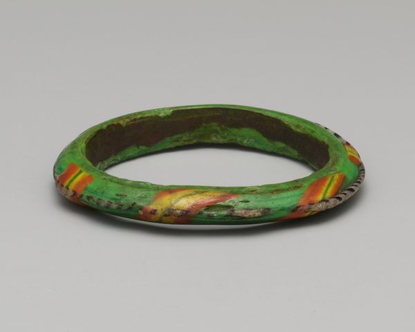 Curator: This beautiful bracelet, crafted sometime between the 14th and 15th centuries, resides here at The Art Institute of Chicago. Editor: It's striking! I'm immediately drawn to the contrasting colours and textures – the smooth dark base against those playfully patterned embellishments. Curator: Indeed. Consider its materials: textile, glass, and wood. The combination points to a society where access to such diverse media wasn't a given, which perhaps tells us about trade routes and economic exchange of the time. Editor: Absolutely. And if we dig into the making process, understanding the labor involved could shift how we perceive its value. Was it crafted by a skilled artisan or mass produced? Each possibility changes its meaning significantly. What was its original purpose, adornment or symbolic? Curator: Considering that this was Medieval times, jewelry such as this also conveyed one's standing in a highly stratified society, gender roles, religious affiliations, and social identities through specific materials, designs, and wearing conventions. Editor: The use of specific types of glass is interesting—was it locally sourced, or indicative of broader trade networks and consumption habits? The wooden component grounds the textile element – did one inform the development of the other? Curator: Those are good questions to ask! Further analysis could reveal if these elements are tied to cultural or political symbolisms, perhaps as a tool for claiming status. Each coloured element might subtly reaffirm beliefs or question conventions. Editor: To me, this object represents the convergence of social factors, and skilled hands manipulating materials, highlighting craft rather than ‘fine art’. It demands recognition not just for its decorative function but as a piece revealing past methods of manufacturing. Curator: I see it a little differently; through wearing, the jewel transcends mere object status and becomes tied up in matters of visibility, desire and performance. But either way, what is fascinating, surely, is how a small artefact evokes huge discussions! Editor: Precisely! And considering materiality and its fabrication alongside broader systems offers richer interpretations, highlighting craft and human interaction.
