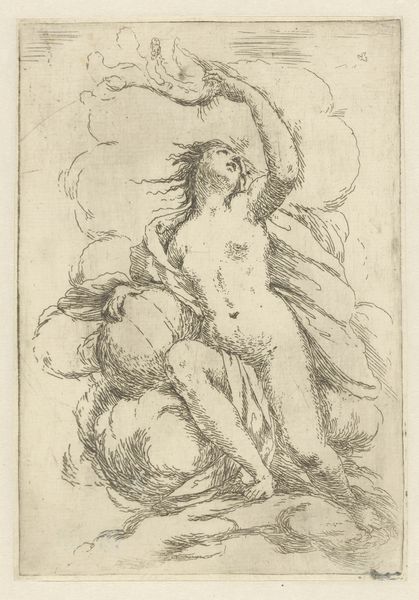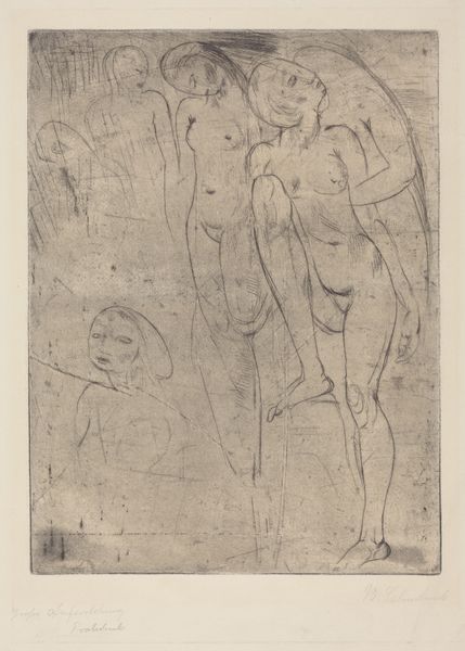 Curator: Here we have Wilhelm Lehmbruck’s etching "Woman and Child", created in 1914. The mood is surprisingly tender. The delicacy of the etched lines almost softens the forms. Editor: Surprisingly? To me, the lines feel fraught with the tension of an Expressionist piece, hinting at psychological unrest. The vulnerability of the naked female form and child really leaps out at you. Curator: Yes, but the composition! Note how the forms of the woman and child, rendered in the foreground, possess a distinct solidity compared to the ethereality of the figure lurking in the background. This layering creates depth and allows the foreground figures to command the space. Editor: I read it as alienation. Look at the child; their eyes are cast downward, their stance almost apologetic in the shadow of their mother who seems entirely burdened. Curator: Precisely. But burdened forms lend themselves to a more objective approach, don't they? The materiality of this piece hinges on this visual opposition between the heavy outlines and spare lines and the ethereal impression conjured in certain planes. Editor: Perhaps. But consider also that in 1914, German Expressionists are on the brink of WWI; Lehmbruck enlisted in the German Reserve Hospital Corps. The anxieties about family, survival, the next generation—it is difficult not to view such pieces without that cultural context. Is this familial intimacy or societal anxiety? Curator: It could be argued, certainly, that we are projecting backward. Lehmbruck himself spoke often of striving to realize “inner visions”. We cannot discount a personal drive that eschews politics in favor of a semiotic language of his own devising. Editor: Semiotics function *within* cultural language. Look, whatever one concludes about this etching's composition, it speaks powerfully to the myriad complex emotional and cultural currents that shape individual experience, and motherhood itself. Curator: A truly remarkable intersection of technique and theme. Editor: Indeed, and another compelling case study in the convergence of personal narrative and the human condition.