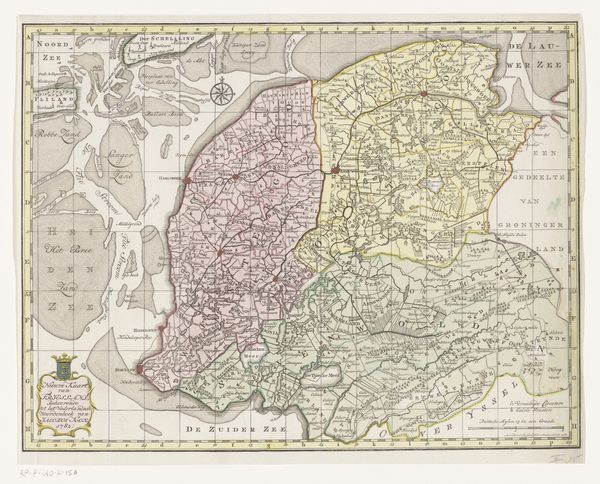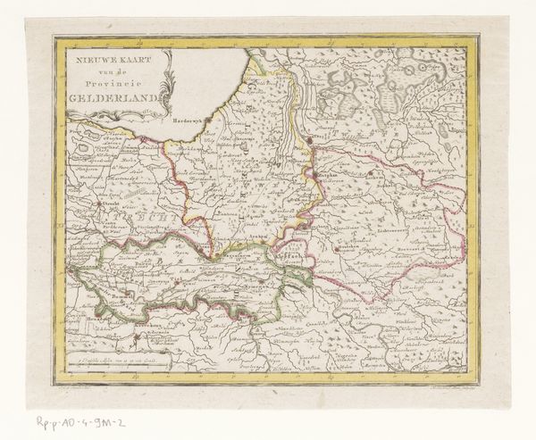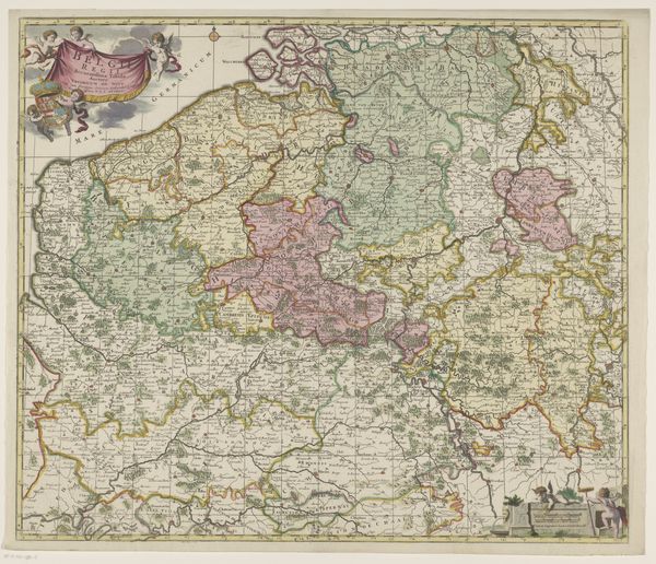 Curator: This is "Deel van een kaart van de Oostenrijkse Nederlanden," or "Part of a map of the Austrian Netherlands," created sometime between 1737 and 1757 by Tobias Conrad Lotter. It combines etching and engraving techniques. Editor: My first impression is one of immense detail and constraint. There's something both beautiful and unsettling about the act of trying to capture a territory within clearly defined, imposed borders. The colors almost feel like codes signifying something about who controls what. Curator: The production of maps during this period was intertwined with colonial power and trade routes. The printing process itself involved highly skilled labor, from the engravers who transferred the cartographer's design onto the copperplate to the printers who pulled each individual impression. We should think about the political economy of mapmaking. Editor: Absolutely. And if we zoom in—figuratively—we can consider this map as a constructed narrative, not just objective data. The very act of selecting what to include, which territories to emphasize, what is labeled with care versus left blank reflects someone's agenda. Notice how cities are adorned with symbolic structures representing status, or how natural elements appear merely in service to property markings. Curator: Yes, and consider the materials: the copperplate itself, sourced through global trade networks, the inks, the paper. Each material has its own history, reflecting patterns of resource extraction and consumption integral to the map's creation and purpose. What about distribution: Who consumed this map? The social hierarchies that produced and benefited from this specific method of visualising the land. Editor: It's compelling how a seemingly neutral cartographic record speaks volumes about eighteenth-century Europe's complex web of power, territorial ambitions, and, ultimately, control of both resources and populations. I can’t ignore the undercurrent of potential conflict and disputes simmering beneath the veneer of ordered representation. Curator: Thinking about the physical labor required to produce a single map shifts our understanding away from this being simply an artistic object. The hands-on, repetitive processes are just as essential. Editor: Ultimately, looking at art like this reminds me that these images aren't just passive records of a particular geographical space, but interventions shaping our understanding and relationships to that space.
