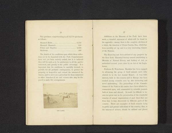 Editor: Here we have a print titled "The Elephant," dating from before 1870 by George Gardner Rockwood. It looks like an engraving, and what strikes me is how it appears within the page of a book alongside text; what story is this print telling us? Curator: Consider the materials and how this image was produced within the context of 19th-century printing. The engraving process itself suggests mass production and dissemination. Is this ‘high art’, or a method of distribution related to science or the public sphere? Does this inform your view of the image's intention? Editor: That's a good question. It definitely doesn't scream "high art." Thinking about it in terms of production and access, its presence in this book suggests a broader reach than a gallery showing, it is almost utilitarian, perhaps illustrating a scientific text about different animal species that are discussed in the book, or about natural history or global trade. Curator: Exactly! The visual object of the elephant serves not just as a representation, but potentially as a tool for understanding Victorian attitudes towards the exotic, colonialism, or even emerging fields like zoology. What might be inferred from its stylized realism against this broader socio-economic background? Editor: That perspective makes me see it differently now. The "realism" isn’t just artistic skill; it reflects a need to classify and document, feeding into Victorian society's engagement with the natural world and, perhaps, even an exertion of control over it. Curator: Precisely. The work’s materiality points to a specific process of production and consumption which ultimately influences our interpretation of its ostensible subject matter. Editor: That's fascinating; by thinking about how the image was made and where it ended up, we uncover new layers of meaning I hadn't considered. Thanks!