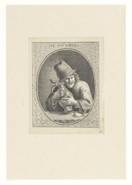 Curator: Welcome. We're looking at an etching dating from the late 18th or early 19th century, titled "Bust of a man in night cap and gown" by Baron Dominique Vivant Denon. Editor: My first impression? Mischievous! He’s got this playful glint in his eye, and the way he’s pointing… there's a real sense of theatricality to it. Curator: Indeed. Observe the composition. The artist employs a circular frame within the rectangular picture plane, focusing our attention sharply on the subject's face and upper torso. Note the masterful use of hatching and cross-hatching. Denon has captured both light and shadow, revealing the textures of fabric and skin. Editor: Absolutely. And that headwear, it’s not exactly a nightcap. More of a turban, a motif often used to evoke the exotic, or perhaps referencing intellectual curiosity. He's got the robes of a scholar, almost mockingly combined with that rather ostentatious head-dress. It does seem to speak to something beyond a mere portrait, doesn't it? Curator: Undoubtedly. The portrait exists not only as a physical likeness but operates as a social signifier. Consider his posture, slightly asymmetrical within the frame, disrupting classical ideals of balance but conveying a sense of animated intelligence. Editor: Perhaps it points to a specific character archetype common during the Neoclassical period— the intellectual libertine, caught between reason and exotic fantasy? I find myself asking about who he represents, or what type he belongs to. He seems like he knows something you don't. Curator: A plausible interpretation. And that hand—so directly engaged with the viewer—becomes a formal element tying the symbolic to the pictorial space. It compels our gaze and completes a fascinating image. Editor: The detail Denon achieves, even in such a small-scale print, really makes him captivating, unsettling, and memorable, all at once. There’s an implied narrative, just out of reach. Curator: Precisely. Denon skillfully transforms an observed figure into a potent and multi-layered statement. Editor: Well, this certainly gave me some leads to follow about 18th century male portraiture. Thanks for pointing the way.