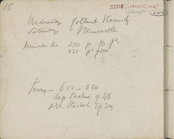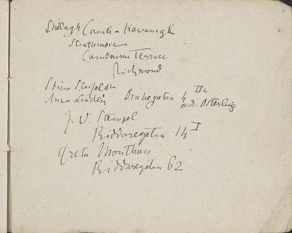 Editor: So, this is "Annotaties" from 1880, made with pencil, graphite, and pastel on paper by Louis Apol. It reminds me of a page torn from a historical sketchbook – almost like a peek into someone’s private thoughts. What catches your eye about this piece? Curator: It immediately brings to mind the tradition of travel and exploration so prominent in the 19th century, particularly the romanticization of the ‘explorer’ figure. We see fragments of what seem to be notes – perhaps names like “Livingstone” or geographical references – suggestive of the period's colonial pursuits and scientific expeditions. Apol, though known for his winter landscapes, places himself, through this "sketchbook" in this cultural milieu. It's interesting to consider who he imagines as the viewer of these 'annotations'. Does this make you consider how we use and view sketchbooks today? Editor: That's fascinating, I didn't initially make the connection to exploration. The act of handwriting, the seeming randomness – it feels quite personal, almost resisting public consumption. Curator: Indeed. Consider how such a piece might have been viewed at the time. The "hand-written" quality suggests authenticity, a direct link to experience, yet presented as a composed "artwork." Is it genuine private musings or a performance of intimacy intended for an audience aware of exploration narratives? That tension speaks volumes about the evolving public role of art in that period. Editor: I hadn’t thought about the performance aspect before. I was focused on the intimate nature, but it makes sense that Apol, as an artist, was always aware of an audience, shaping even his private "annotations." Curator: Precisely! Reflecting on it, perhaps Apol intended to provoke thought about the ethics and social impact of the colonial era. Editor: That really makes you think about how artists use personal narratives to comment on broader socio-political contexts. Thanks! Curator: And for me, you helped bring a fresh perspective on how audiences engage differently with art across time. A pleasure.
