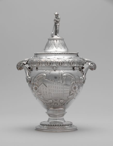 Editor: This is a silver Ewer by Baldwin Gardiner. Its sinuous form and elaborate decoration give it an elegant presence. What strikes you most about its composition? Curator: The interplay between the smooth, reflective surfaces and the intricate, engraved details is key. Notice how the eye moves from the base, up the fluted stem, to the body adorned with rococo flourishes. It's a study in contrasts, isn't it? Editor: Absolutely, the contrast between the ornate patterns and the sleek surfaces is very compelling. Thank you for sharing your insights. Curator: My pleasure. The success of this ewer lies in how these visual elements coalesce.