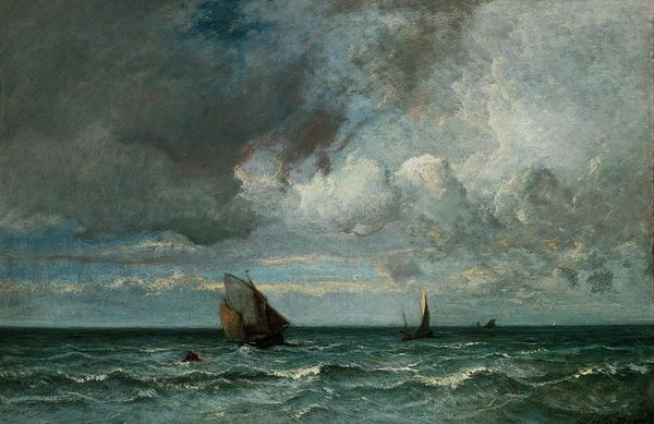 Andreas Achenbach captured this seascape with oil on canvas, a scene charged with both the serenity of a sunset and the impending drama of a thunderstorm. Born in Germany during a period of significant social and political change, Achenbach, like many artists of his time, was drawn to nature as a site of emotional and spiritual expression. Yet, his seascapes are not merely picturesque; they invoke the sublime, a concept deeply rooted in the Romantic era's fascination with the power and unpredictability of nature. The painting reflects a society grappling with industrialization and its impact on the environment. The boats, vulnerable against the vastness of the sea, perhaps symbolize the fragility of human endeavor in the face of nature's force. The approaching storm suggests not just a weather event, but a broader sense of unease and the looming threat of change. Achenbach's work invites us to contemplate our place within a world that is both beautiful and indifferent to our presence.