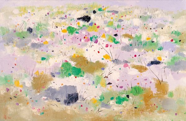 Curator: This is John Miller’s "Algarve Landscape." Notice the application of acrylic paint onto the canvas. It really captures the bright sun of southern Portugal! Editor: My first impression is tranquility. The cool blues and greens create such a calm, serene atmosphere. It's like a visual sigh. Curator: Miller clearly favors the "plein-air" approach, judging from the quick, decisive strokes. This work speaks to the broader Impressionist movement—I can see a resemblance to artists like Monet. It really makes you think about the labor behind landscape painting and the shift towards painting outdoors. Editor: It does echo that style but the colors have more boldness, which makes me wonder about the societal factors encouraging artists to be more experimental and abstract. You know, moving away from strict representation. Was the gallery scene receptive to these bold strokes or did Miller perhaps encounter resistance? Curator: Well, the layering of acrylic suggests a possible dialogue between the artist and his chosen medium. Acrylic paints gained more availability around this period so perhaps his interest might lie simply with testing the material. And yes, while not explicitly a protest, the work reflects the challenges faced by modern artists navigating traditional expectations with readily available new art materials. Editor: Precisely! "Algarve Landscape" represents more than just a scene; it showcases the dynamic interplay between material availability, and also social acceptability that shapes the work we get to appreciate in gallery spaces. So it presents a question: Is that a pure depiction or an interpretation shaped by an art world hungry for the 'next thing?' Curator: Fascinating points! It truly gives new meaning to the landscape tradition. I appreciate you connecting Miller’s choice to paint with the market changes around him. Editor: Thank you! I like your observation regarding Miller’s dialogue with the painting process. The layering of the acrylics and plein-air, really brings into relief the production and display of these art forms, not only for artistic means but, also a challenge towards convention.
