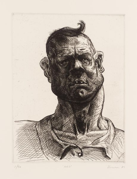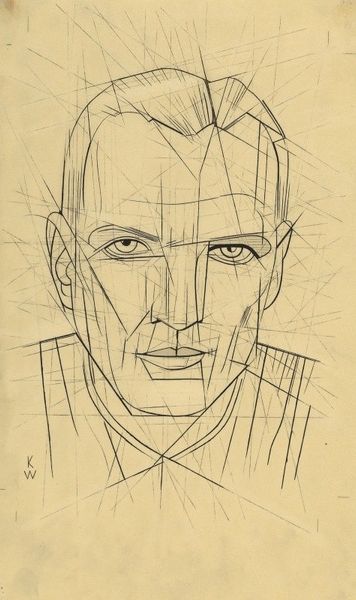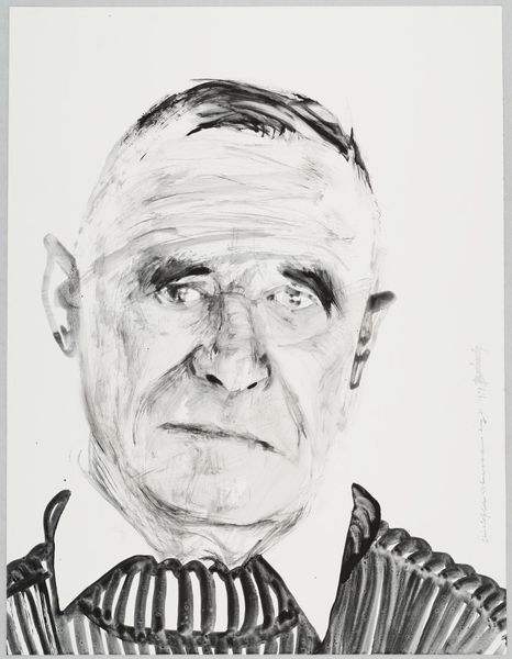 Curator: We’re looking at Irving Penn’s "Self-Portrait in Cracked Mirror" from 1986, a gelatin silver print. The monochrome and stark lighting immediately give it a weighty presence. What stands out to you initially? Editor: That shattered reflection immediately evokes themes of fragmentation, the breaking of the self. The cracks disrupting his face, are they suggesting fractured identity? It feels laden with symbolism about the artist's inner turmoil. Curator: Fascinating point. Considering Penn's background in commercial photography, this experimentation with self-portraiture in 1986 might indicate a departure. It could signal a moment of artistic recalibration, of deconstructing his own established image, quite literally by breaking a mirror. Editor: Yes, think of the mirror as a longstanding symbol of self-reflection, and the cracks now disrupting the image call into question the stability and truth of that reflection. He's forcing us to see the unreliability of self-perception. Mirrors, reflections—they play important roles across art history, of course. Here, the fragmentation suggests not a single unified self, but multiple selves, or even a disrupted sense of being. Curator: It makes you think about the printing process itself, doesn't it? This photograph's tangible qualities are not diminished, even with its conceptual aims. Consider the labor required to get the composition and lighting just right, let alone incorporating a literal shattered mirror as a material component. Editor: Absolutely. And it’s a particularly compelling act to photograph oneself via this imperfect reflective material. What cultural significance does the damaged mirror hold? Discarded luck, perhaps? Curator: Good question. Given Penn's commercial work, could he be alluding to an obsolescence of images or ideals? Are we seeing him critique photographic mediums, too? It definitely provokes consideration. Editor: Right. In essence, we’re left to confront not just Penn’s likeness but an allegory of selfhood in decline or transition. I’m seeing symbols for much more than simply the individual. Curator: I agree. Considering Penn’s established legacy, seeing this piece as part of a broader production of a craftsman rather than focusing on the fractured imagery expands the discussion in meaningful ways. Editor: Yes, this dive really offers potent points to think about his established images, self-perception, and fractured identities in material objects!