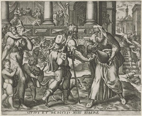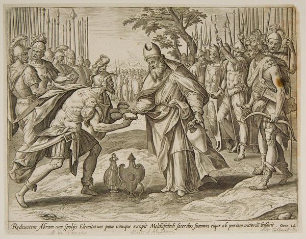 Curator: This print, currently held in the Harvard Art Museums, depicts a scene from the story of Judith and Holofernes, and is attributed to an anonymous artist. Editor: It feels like a stage set. Like everyone’s paused, holding their breath before the next act. The light is intense, almost theatrical. Curator: Yes, the image is rich in detail and likely served a didactic purpose. Prints such as these allowed biblical stories to circulate widely. Editor: All those figures! The artist really crammed them in there. Did that affect its readability, its message? Curator: In that period the visual density wasn't viewed as negative, rather it enhanced the richness of the narrative. Editor: Rich it is, but I see more chaos than clarity. Still, I admire the effort. It has a raw, unfiltered energy. Curator: I agree, and that energy probably explains some of its appeal and continued relevance. Editor: True. Art is, after all, a messy reflection of our equally messy selves.
