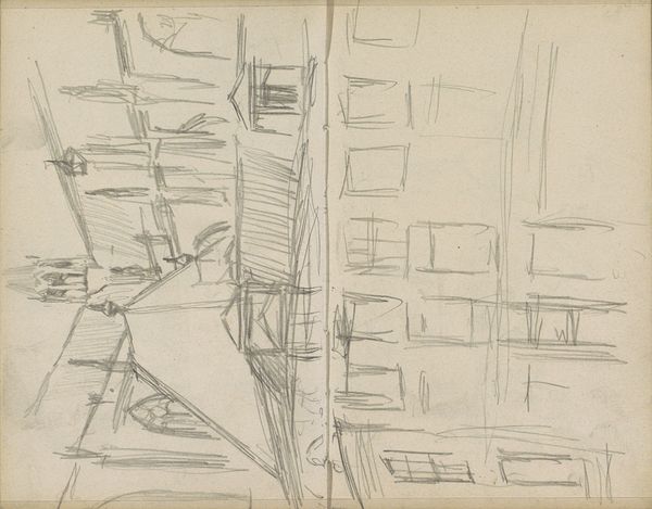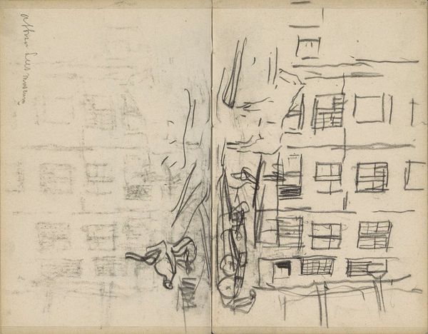 This is a drawing, probably from a sketchbook, by George Hendrik Breitner, showing a view of the Spui in Amsterdam. On the left page, the marks are bold and insistent, but the forms are still open, unresolved. It's like the artist is thinking through the act of drawing itself, a real-time exploration of seeing and representing. Look at the way the artist uses the pencil, sometimes scratching lightly, other times pressing down hard to create dark, decisive lines. The windows on the left are sharply defined, yet on the right page, they dissolve into ghostly impressions. This contrast captures the fleeting, transient nature of perception itself. It makes me think of Philip Guston's late work, raw, honest, and unafraid to show the messy, imperfect process of making art. There’s an energy in its incompleteness, an invitation for us to participate in the act of seeing, questioning, and interpreting. It's a reminder that art is not about perfect representation, but about the journey of exploration and discovery.