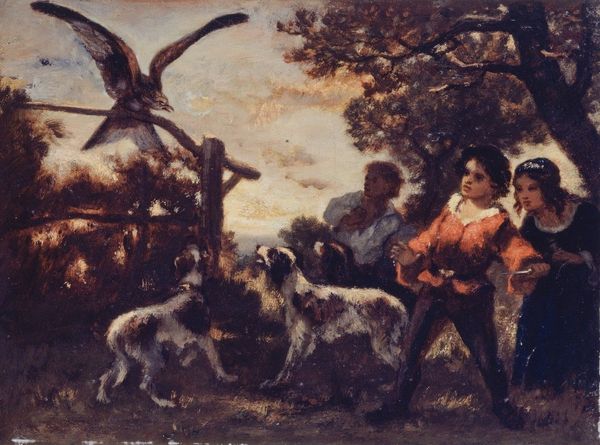 Curator: Carl Spitzweg's "The Fisherman," created around 1850 with oil paints, presents us with a scene of serene, albeit murky, tranquility. Editor: Yes, tranquil is a word that comes to mind. The brown-heavy palette creates a sort of somber mood, almost like a secret ritual being performed in the heart of nature. The dark colours, and even the impasto, weigh heavy in the landscape. Curator: Spitzweg was quite focused on craft here. We can analyze his skillful build-up of paint, noting how it enhances the almost palpable sense of solitude. What’s interesting is thinking about where he acquired his pigments. Where did his canvas come from? Whose labor contributed to the piece before Spitzweg applied his brush? Editor: Right. This painting really evokes a deeper understanding of labor and class dynamics embedded in artistic creation. What were the lived realities of someone whose profession, as is displayed here, depends on environmental stewardship? Curator: Indeed. The artist seems preoccupied with capturing the texture of foliage and earth—there is some textural mastery happening here, particularly when you look closely at the details. It brings forward this fascination with making. Editor: I agree, but I can't ignore the social context. I see not just a lone fisherman, but a meditation on self-sufficiency, a commentary, perhaps romanticized, of escaping the complexities of society in favour of an almost mythical bond with the land. Where does our own cultural romanticizing of rural landscapes contribute to its significance here? Curator: I see your point about this rural fascination. What’s compelling to me is to ponder the social reality of image making at this time, particularly, with the Industrial Revolution on the rise. How are works like this implicated, consciously or not, in an active rejection of this rising economy? Editor: And further, what impact do such idealized portrayals have on social consciousness, masking labor issues by romanticizing the very people from which resources are extracted? Curator: That's where you tease out fascinating aspects that transcend materiality. Thanks for joining me on this journey! Editor: Thank you. It has been enlightening to ponder how brushstrokes of the past inform our dialogues today.